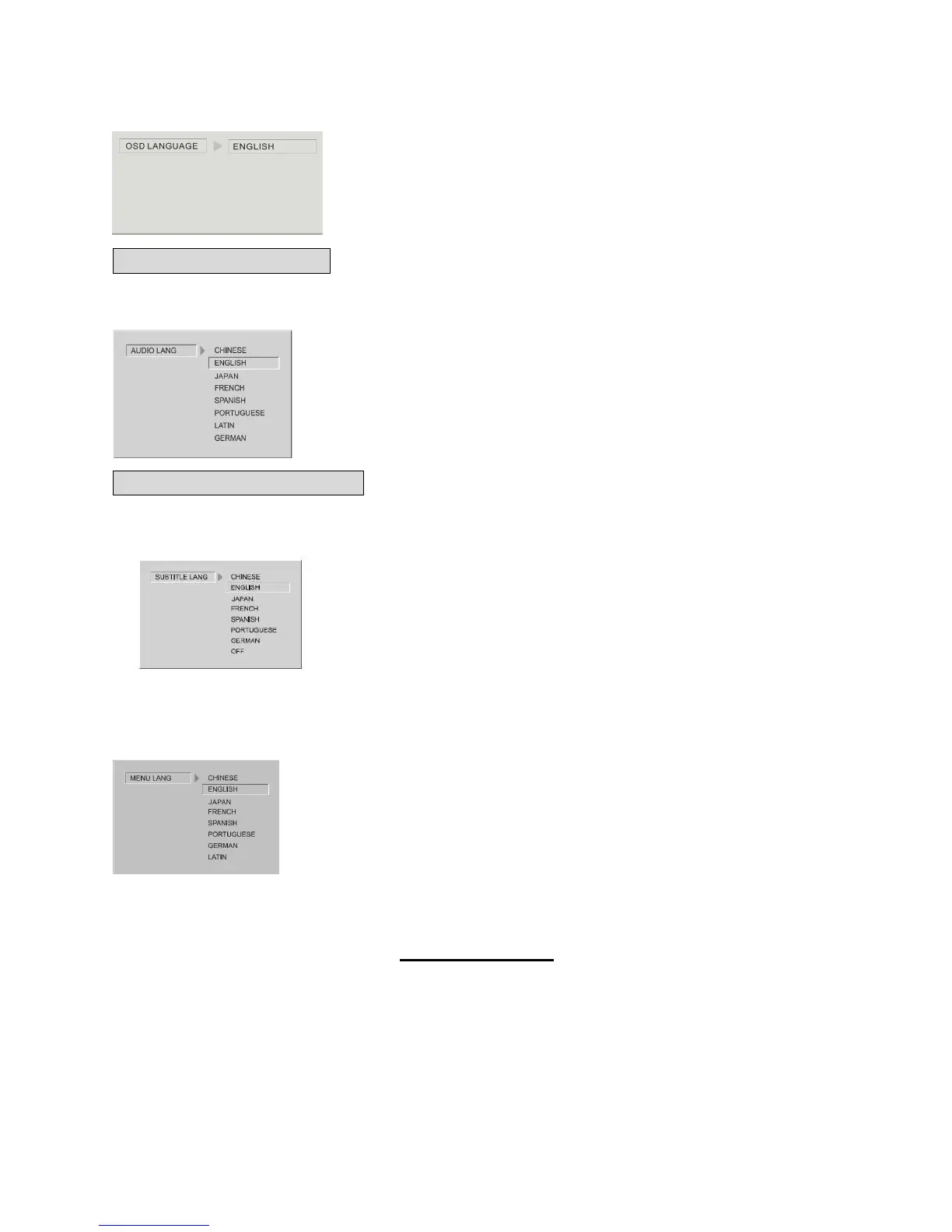MENU LANG:Sets the preferred menu language as the default when playing DVD.