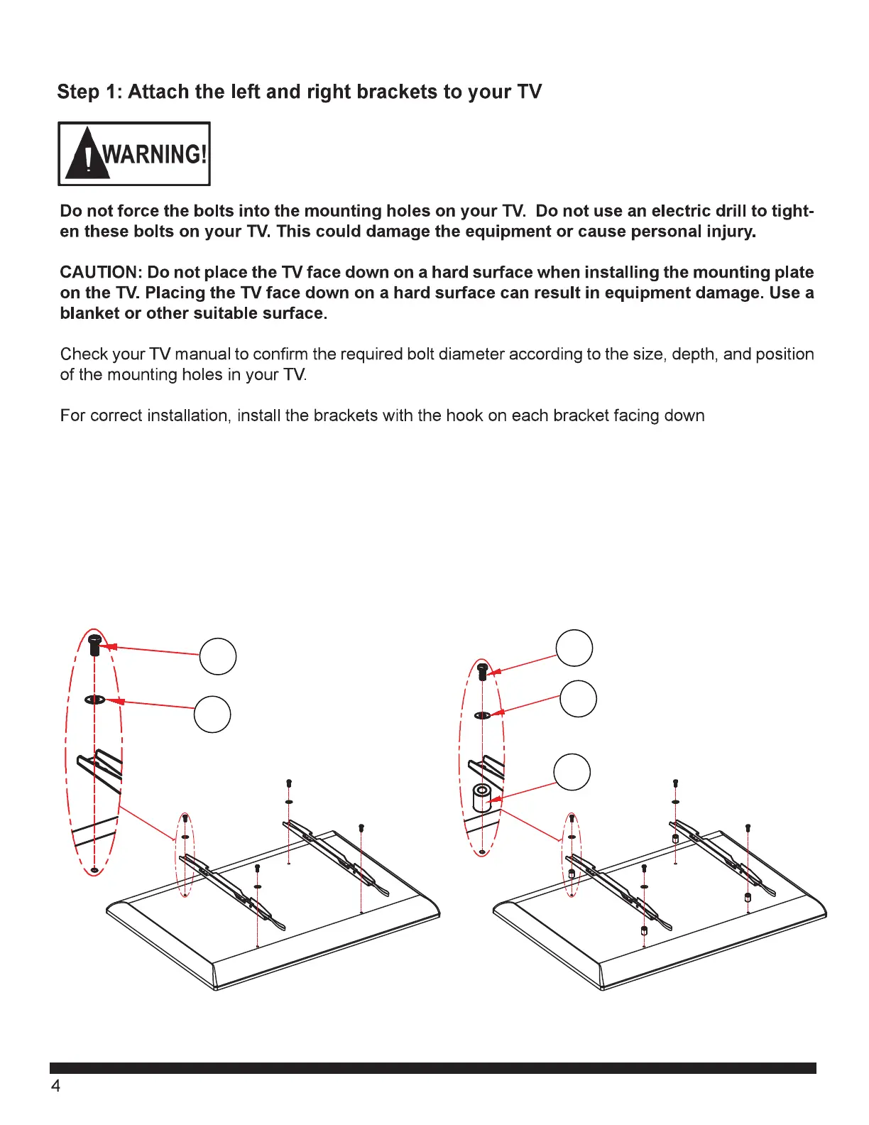 Center the Brackets (2) vertically on the rear of the TV. Attach the Brackets (2) to the rear of the TV