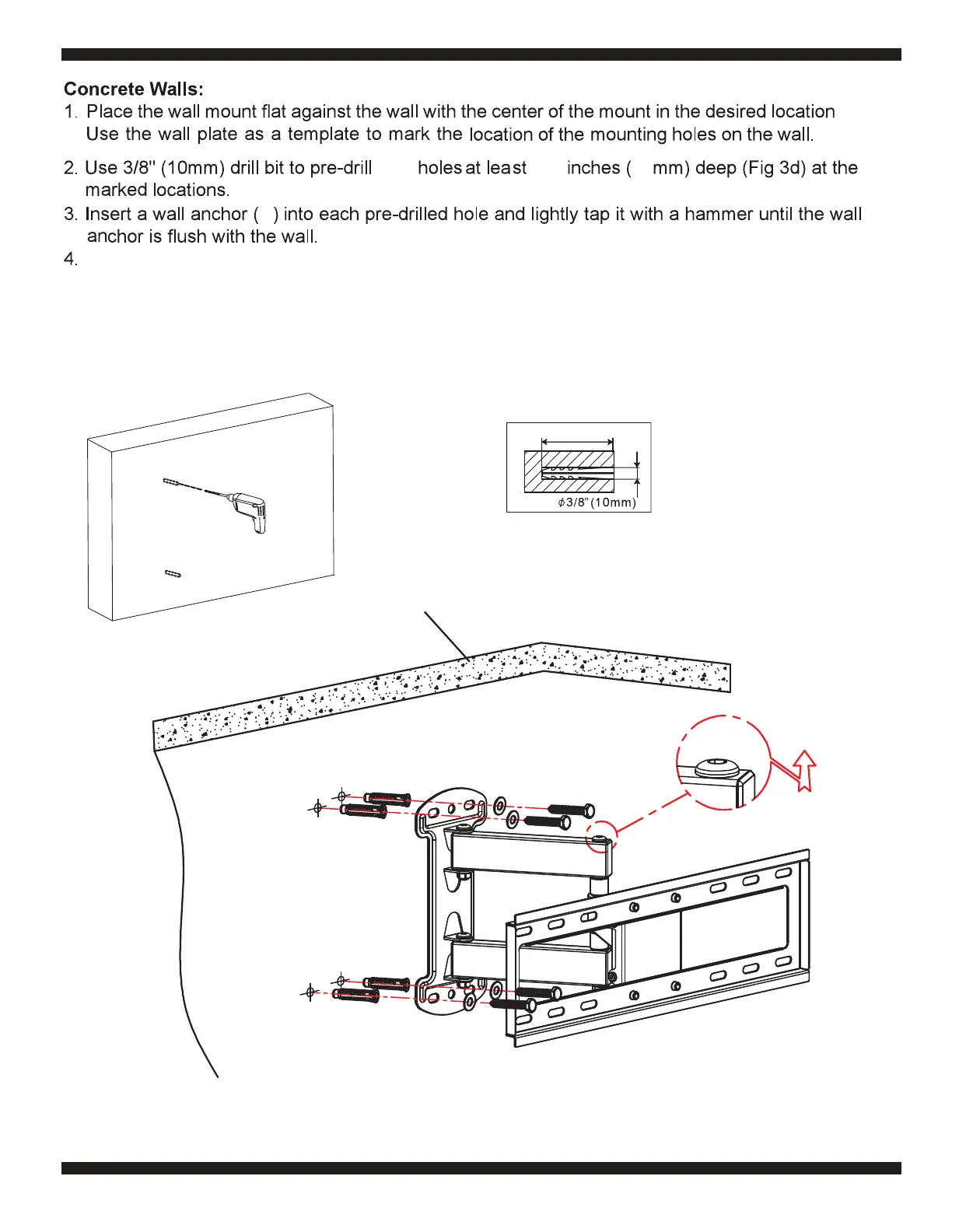 Use a wrench the two long bolts (A), and Washers (C), to attach the wall mount to the wall.