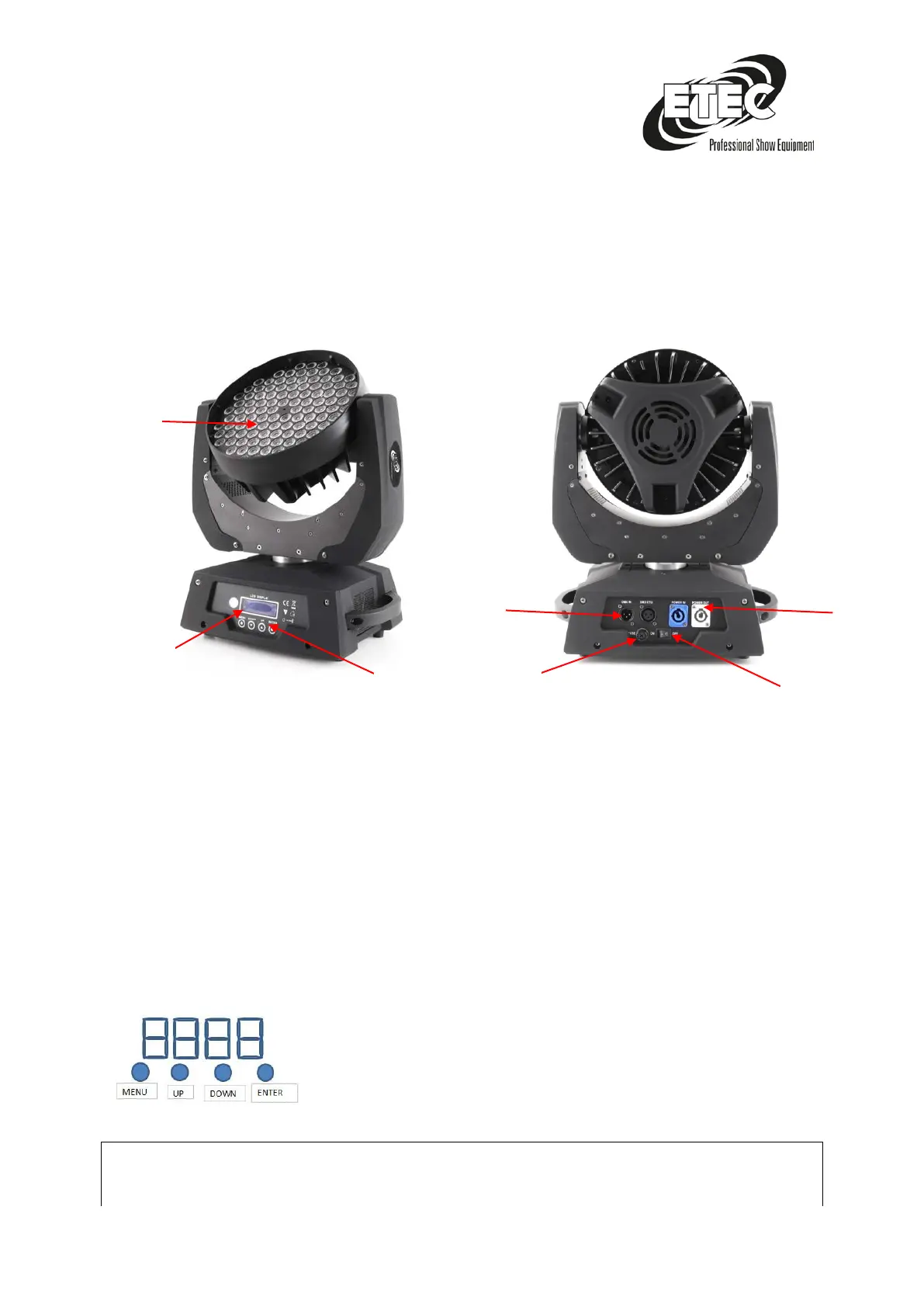 MENU: Function mode selection, such as DMX, Master / Slave, Auto, Sound Mode and Brightness