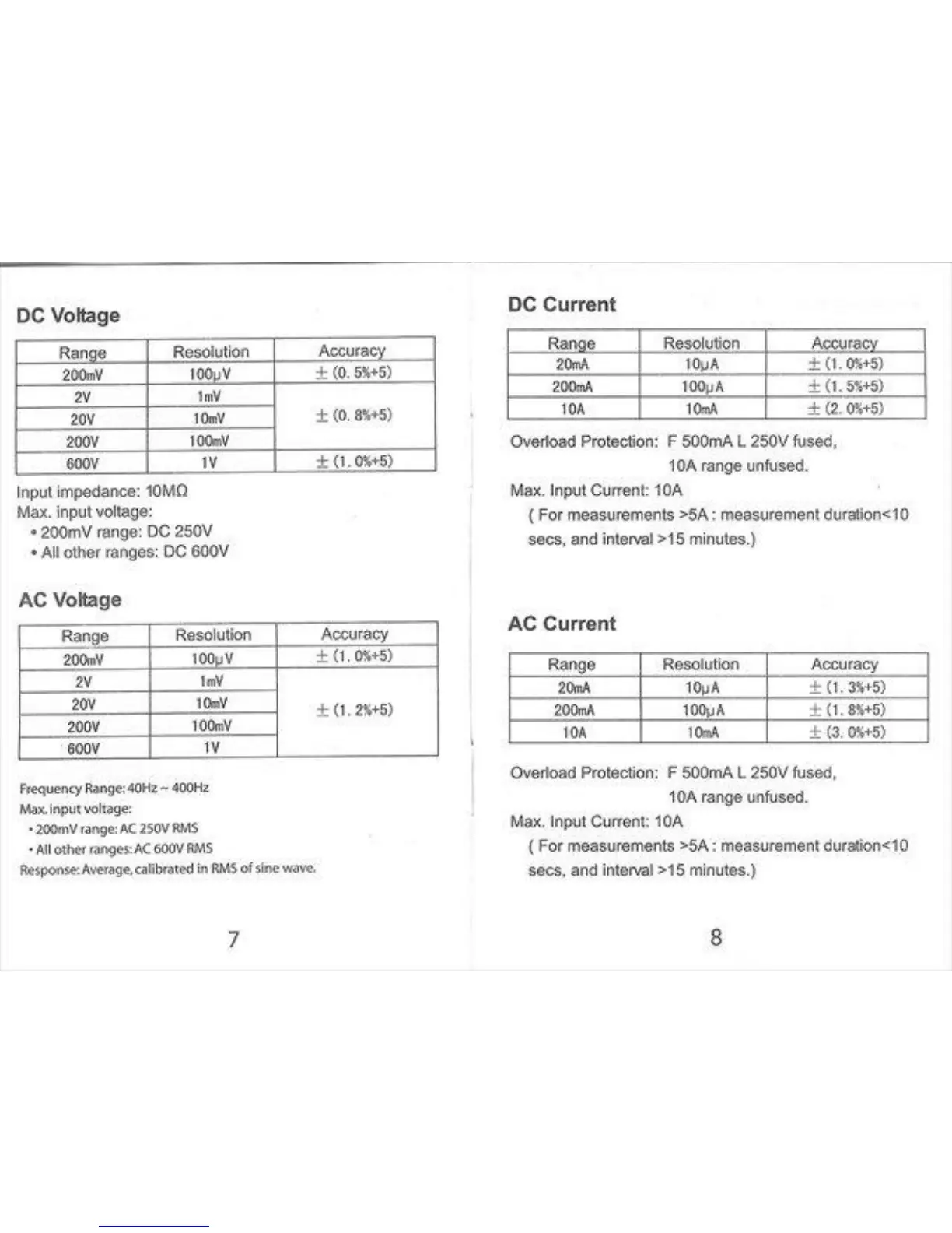 ETEK 10709 - DC AND AC MEASUREMENT SPECIFICATIONS; DC Voltage and Current Specs; AC Voltage and Current Specs