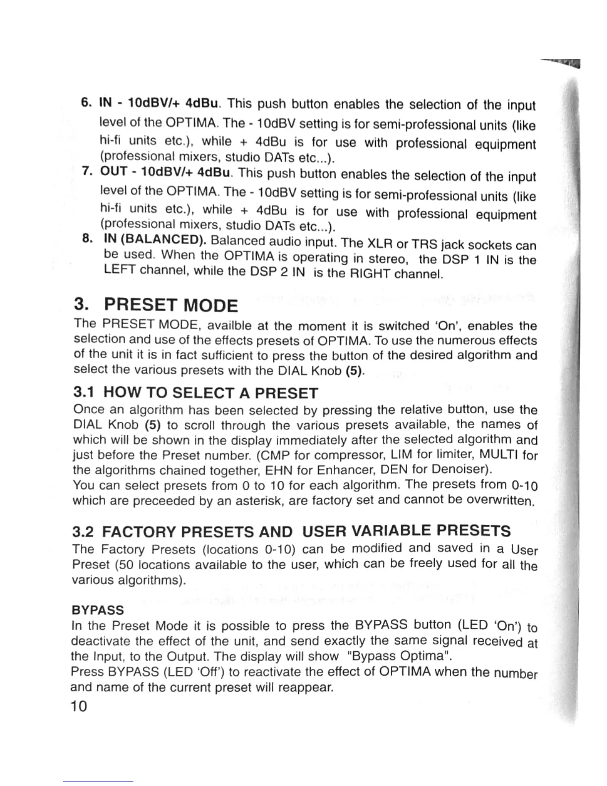 ETEK Optima - In - 10 dBV;+ 4 dBu; Out - 10 dBV;+ 4 dBu; In (Balanced); 3. Preset Mode
