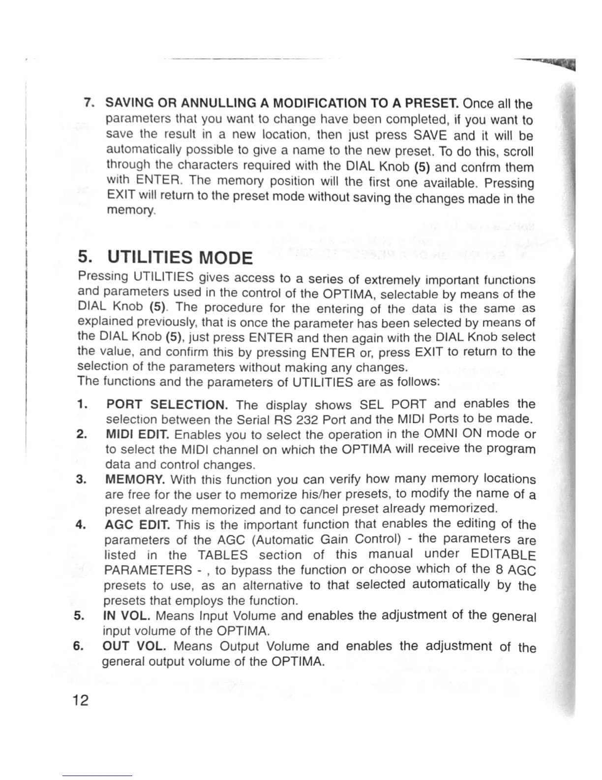 ETEK Optima - Saving or Annulling a Modification to a Preset; 5. Utilities Mode