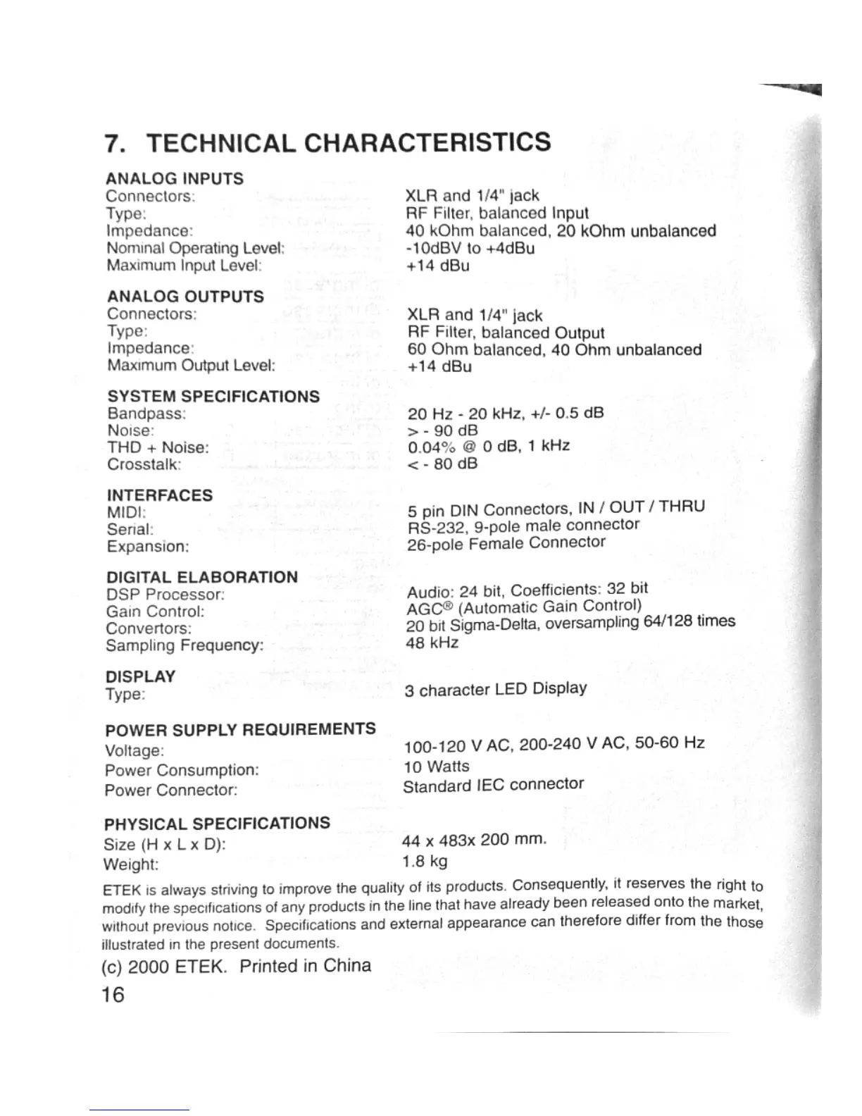 ETEK Optima - Technical Characteristics