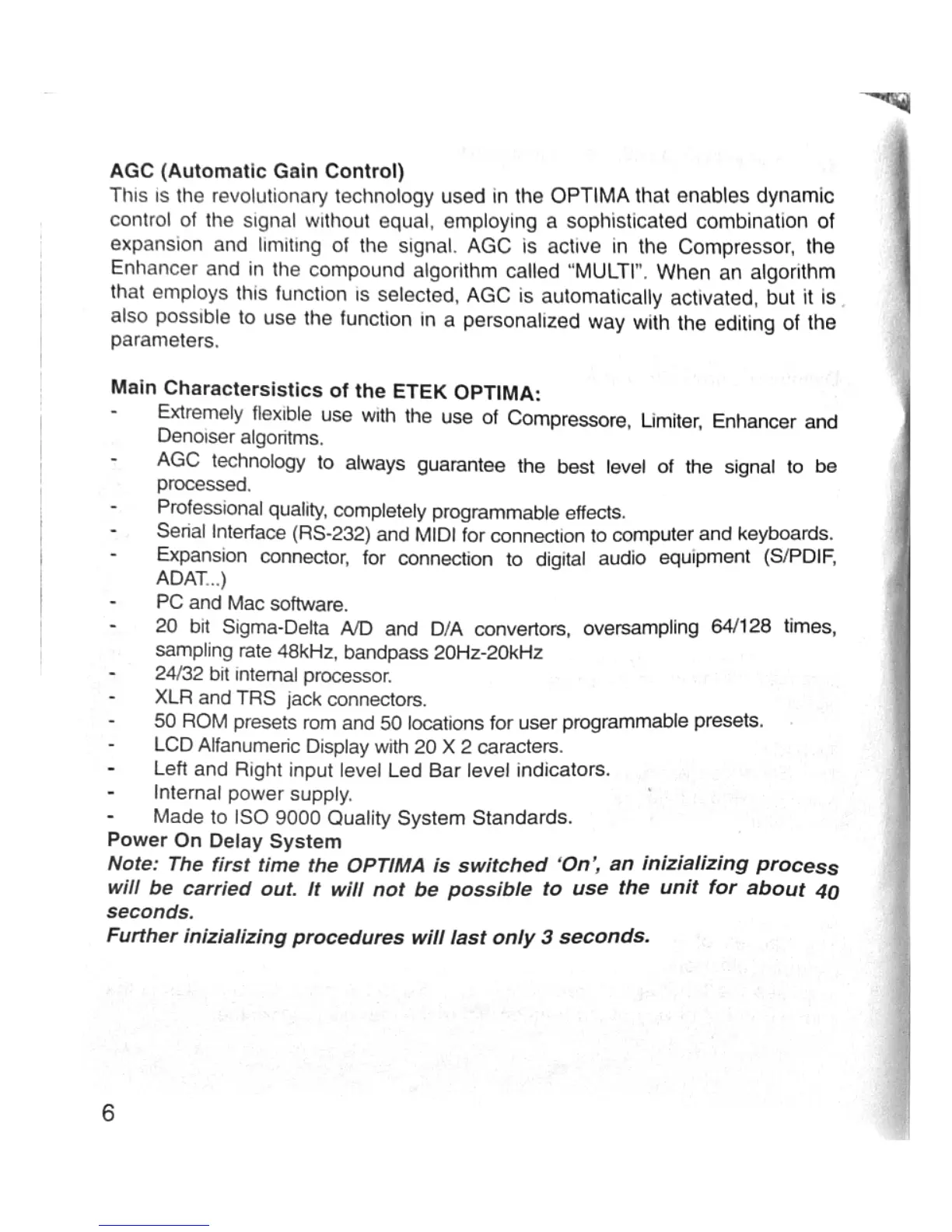 ETEK Optima - AGC (Automatic Gain Control); Main Characteristics of the ETEK OPTIMA