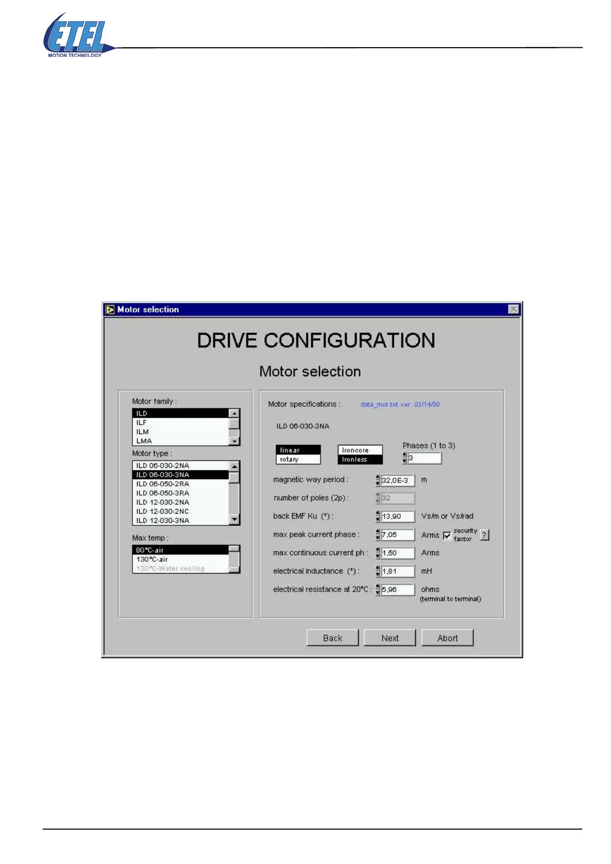 The motors types manufactured by ETEL are listed in the scroll menu.