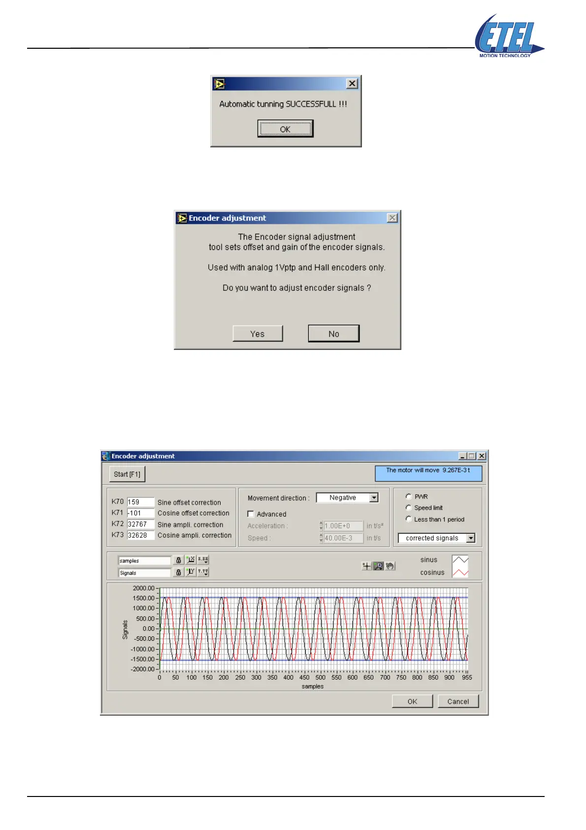• Click on Yes. This function is used to correct the analog encoder's amplitude and the offset errors.