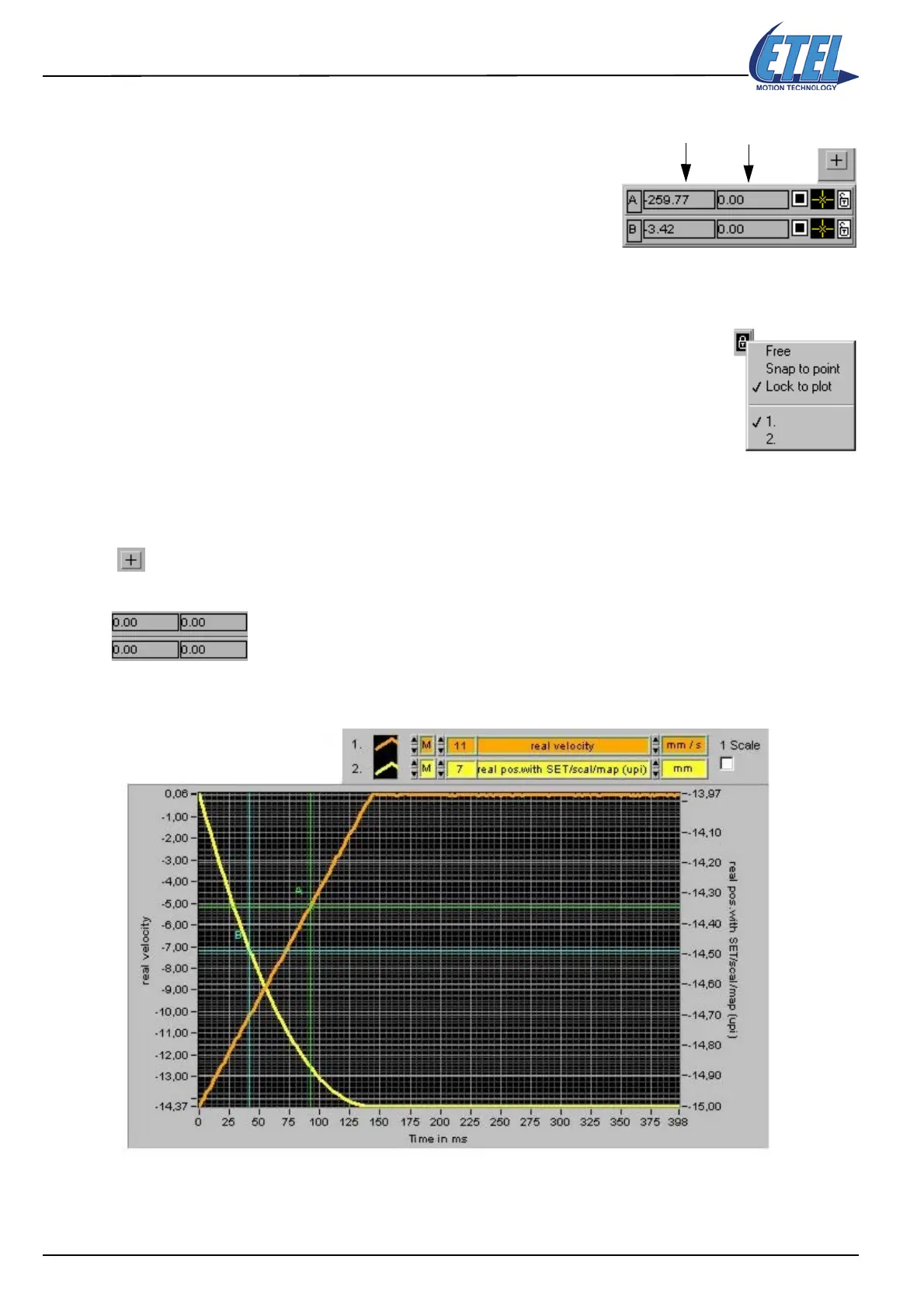 In the window below, the two cursors are in Lock to plot mode. Cursor A is on monitoring M11 (signal trace 1,