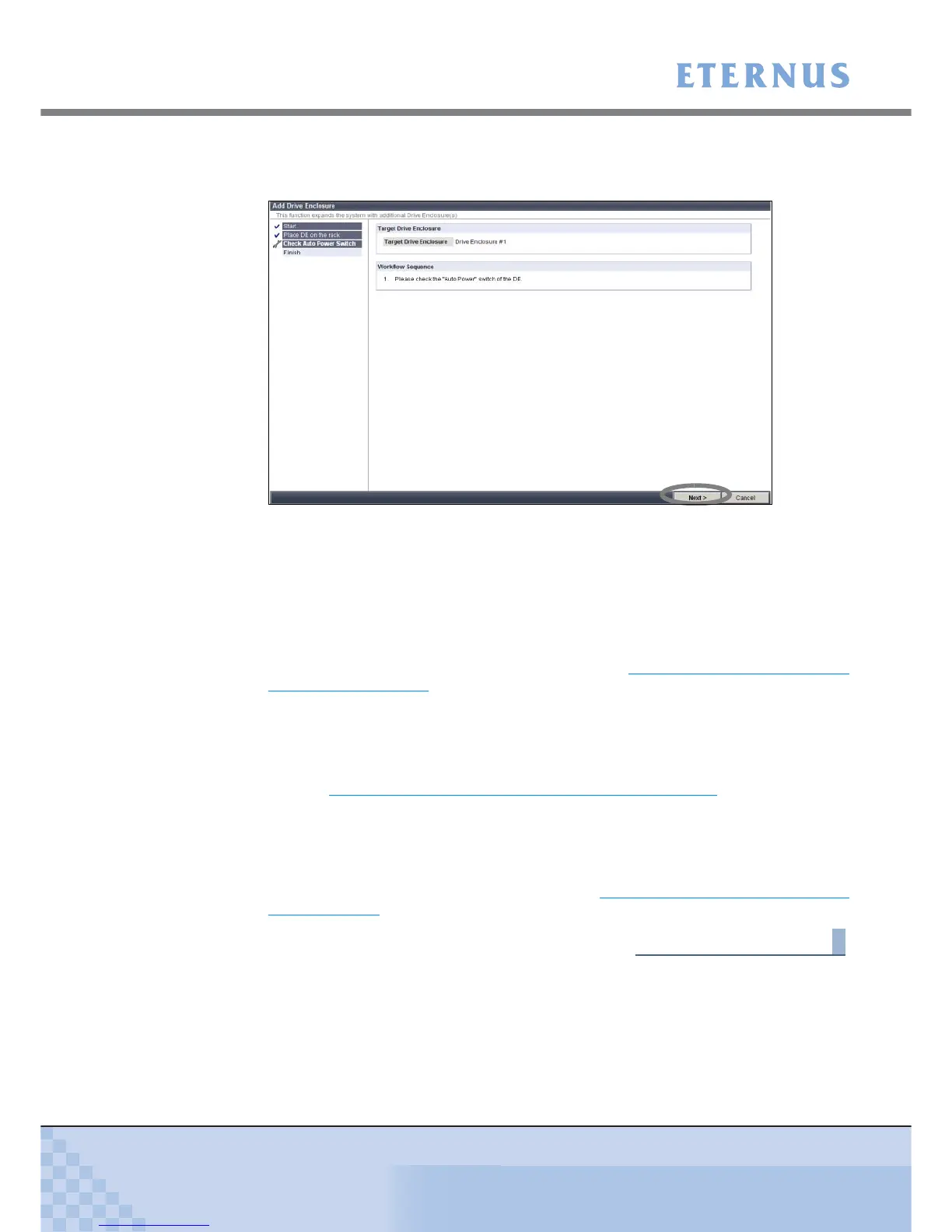 9 Check the drive enclosure's AUTO POWER switch is OFF, and click the [Next >]