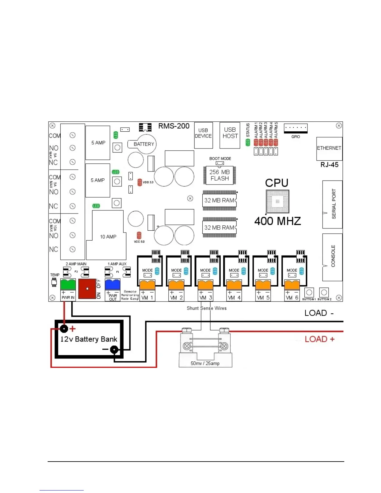 wire is routed to the positive battery terminal by way of a 50 millivolt 25 amp current shunt.
