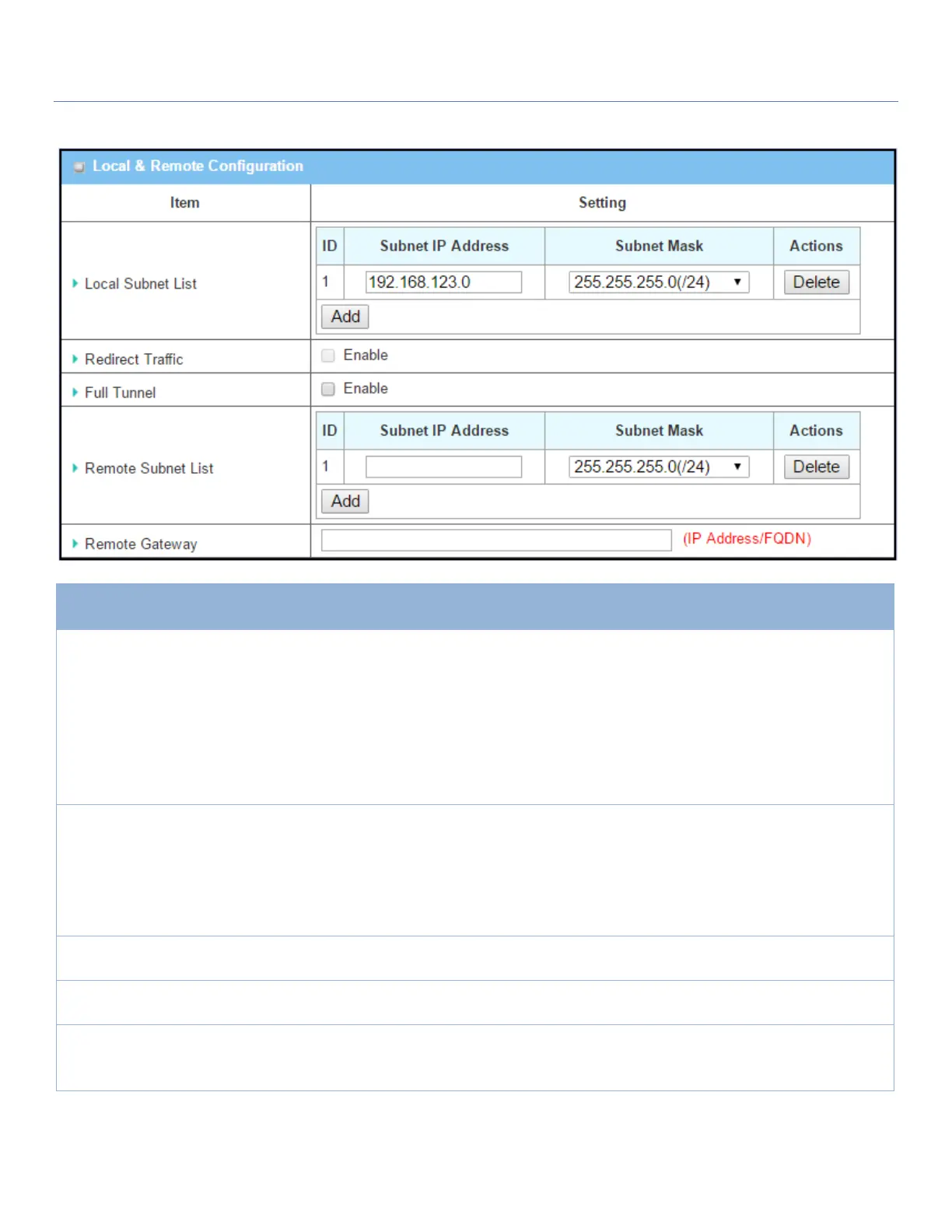 Click the Add or Delete button to add or delete Remote Subnet setting.