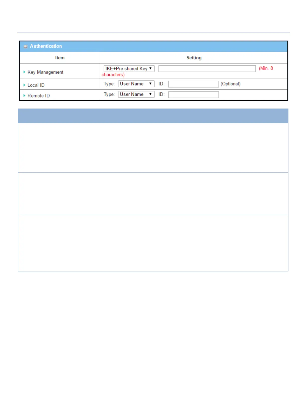 IKE+Pre-shared Key: user needs to set a key (8 ~ 32 characters).