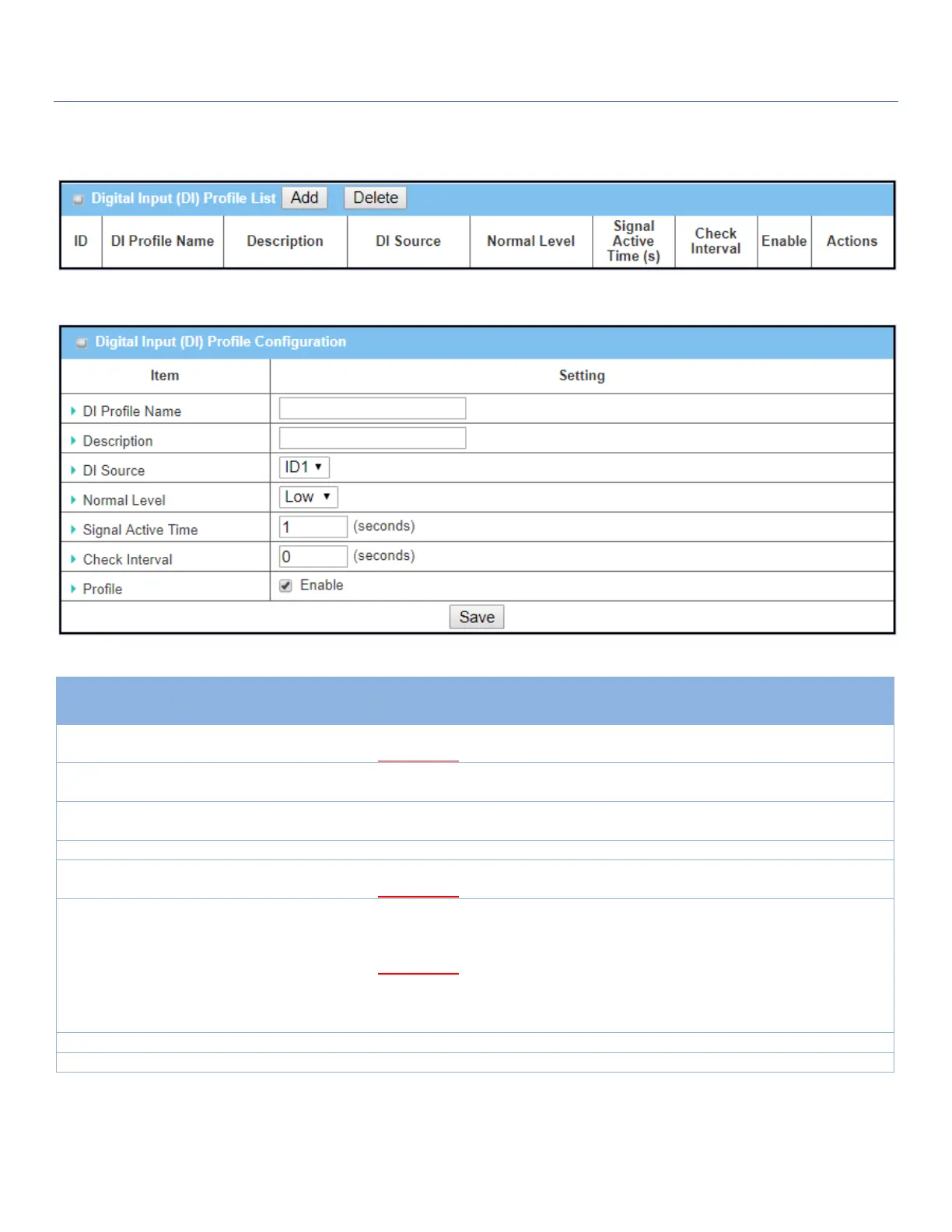 When the Add button is applied, the Digital Input (DI) Profile Configuration screen will appear.