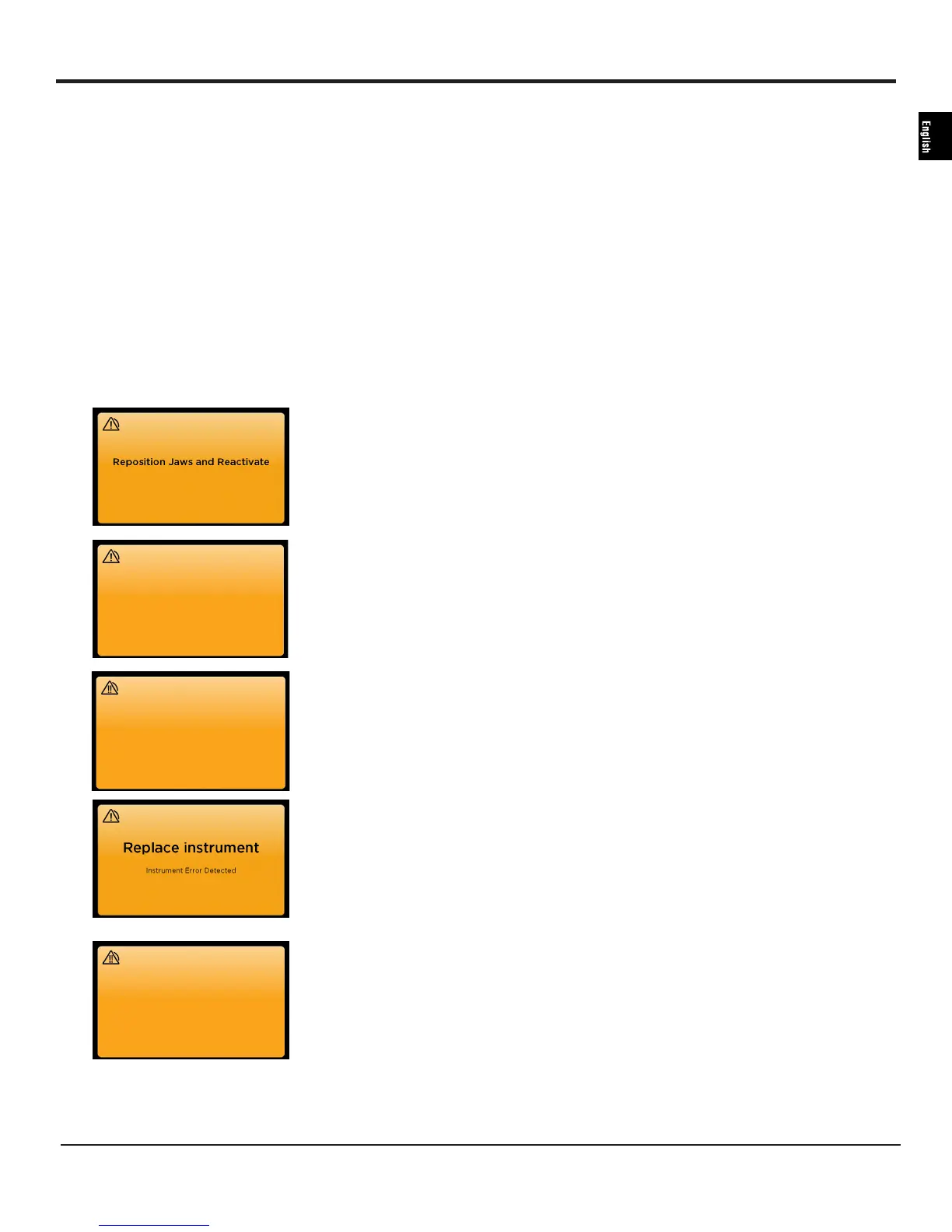 Caution: When an alarm sounds, the generator output stops� If the jaws are closed on tissue and an alarm sounds, do not advance the knife�