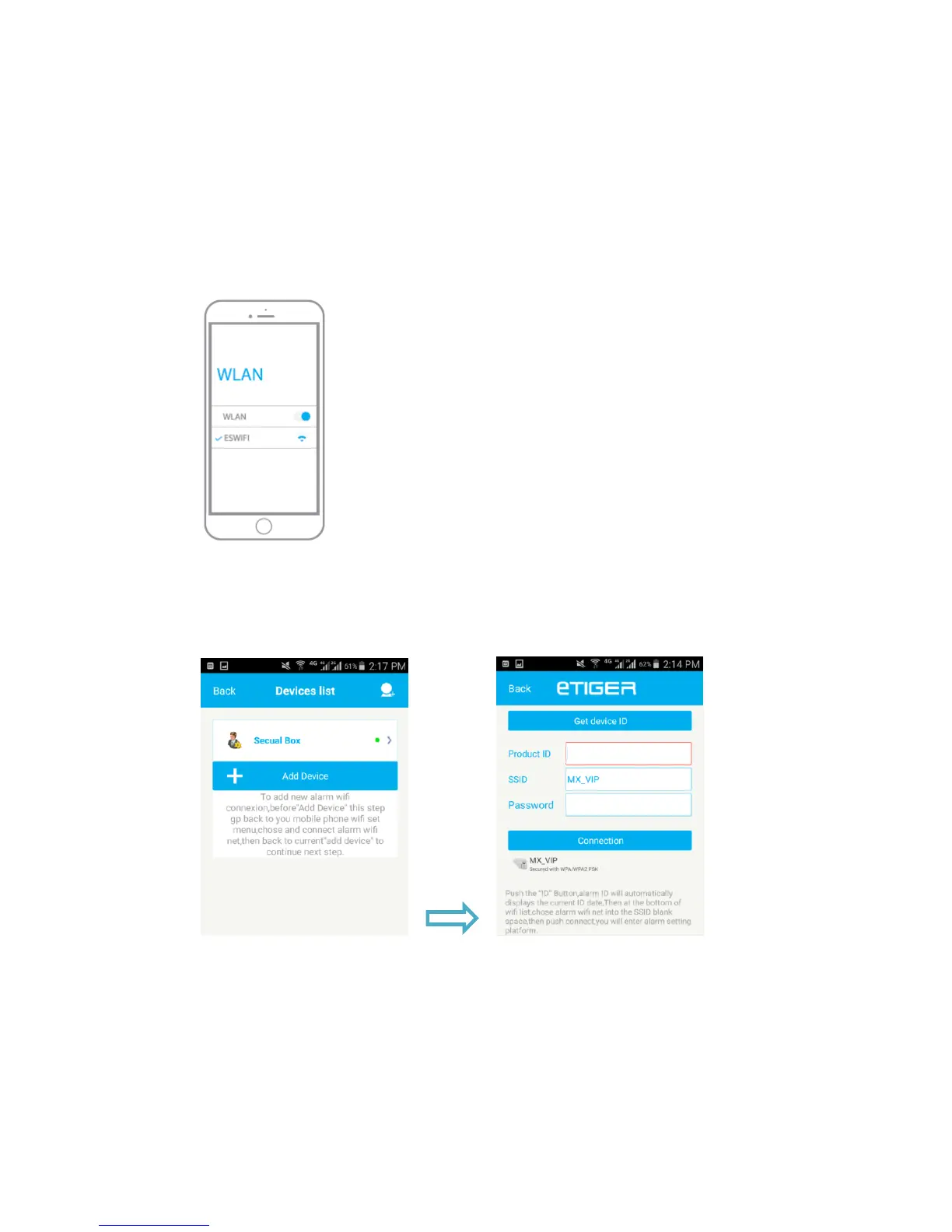 3. Connect the Smartphone to the alarm systems own Wi-Fi network(SSID: ESWIFI. If