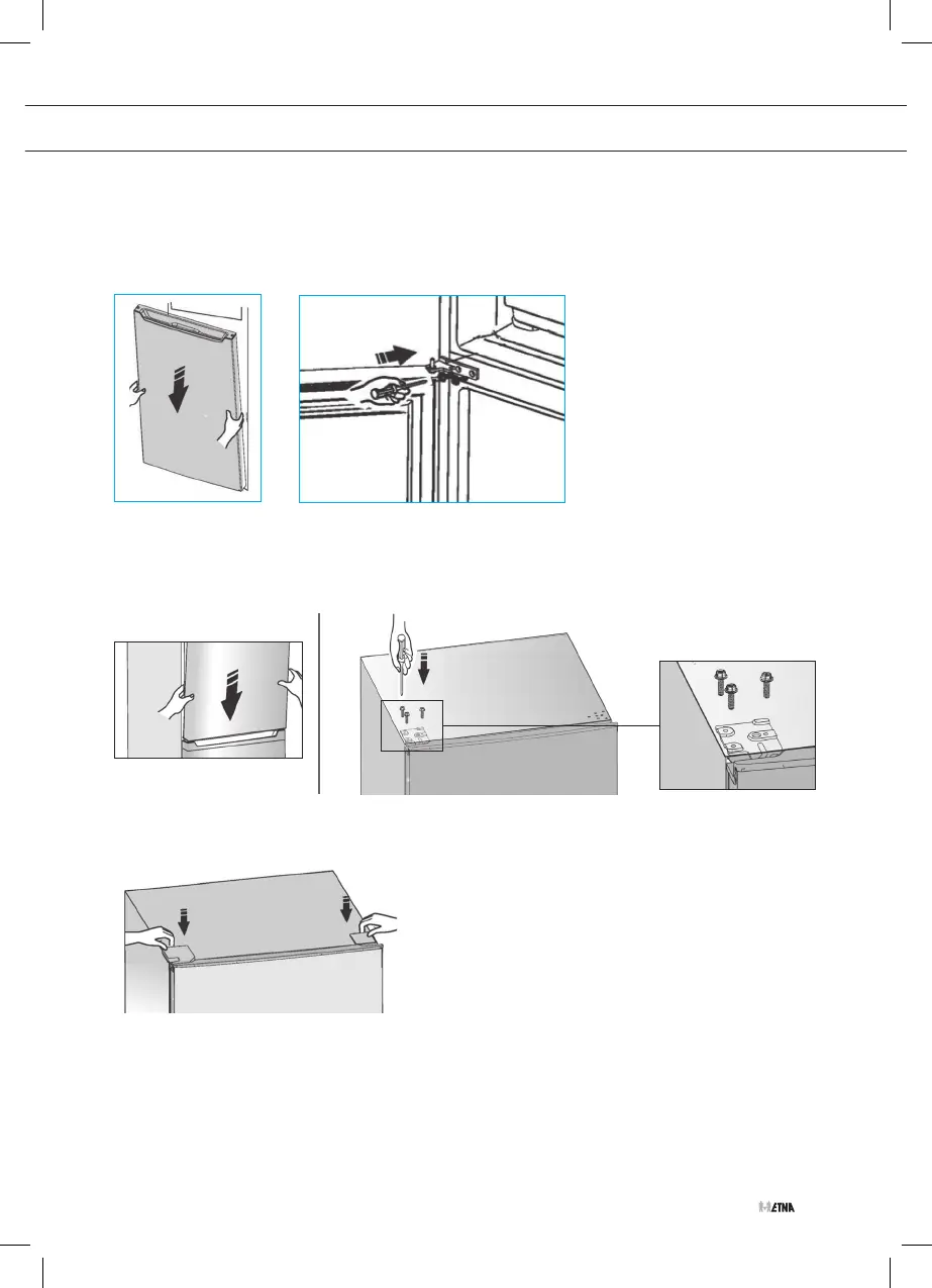 14. Plaats de bovenste deur in het middelste scharnier, zodanig dat de pin van het middelste