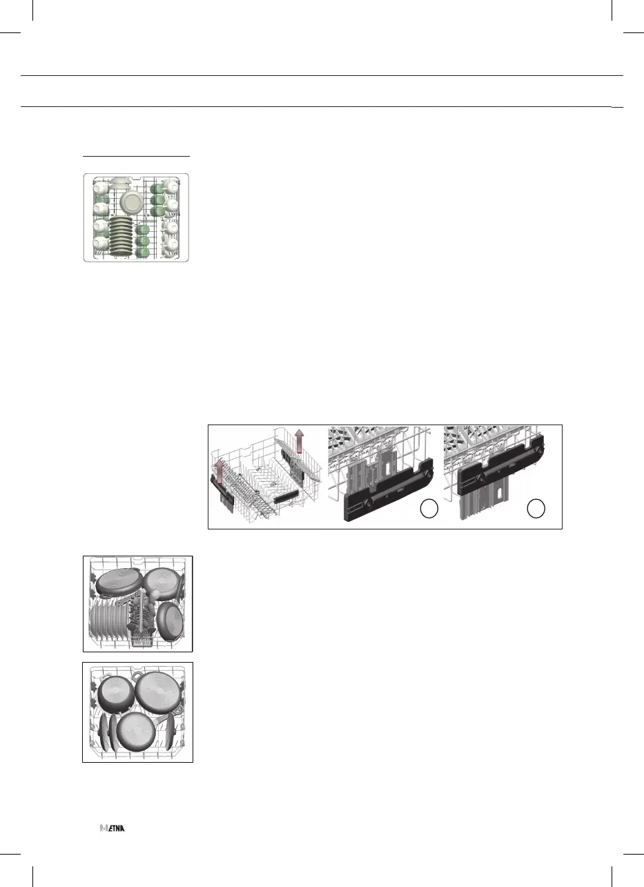 lower basket: pots, pans, pan lids, oven dishes and bowls. Casserole