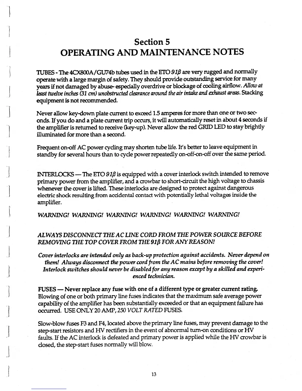 ETO 91B - Operating and Maintenance Notes; Tube Information and Care; Interlocks and Safety Warnings; Fuse Specifications and Function