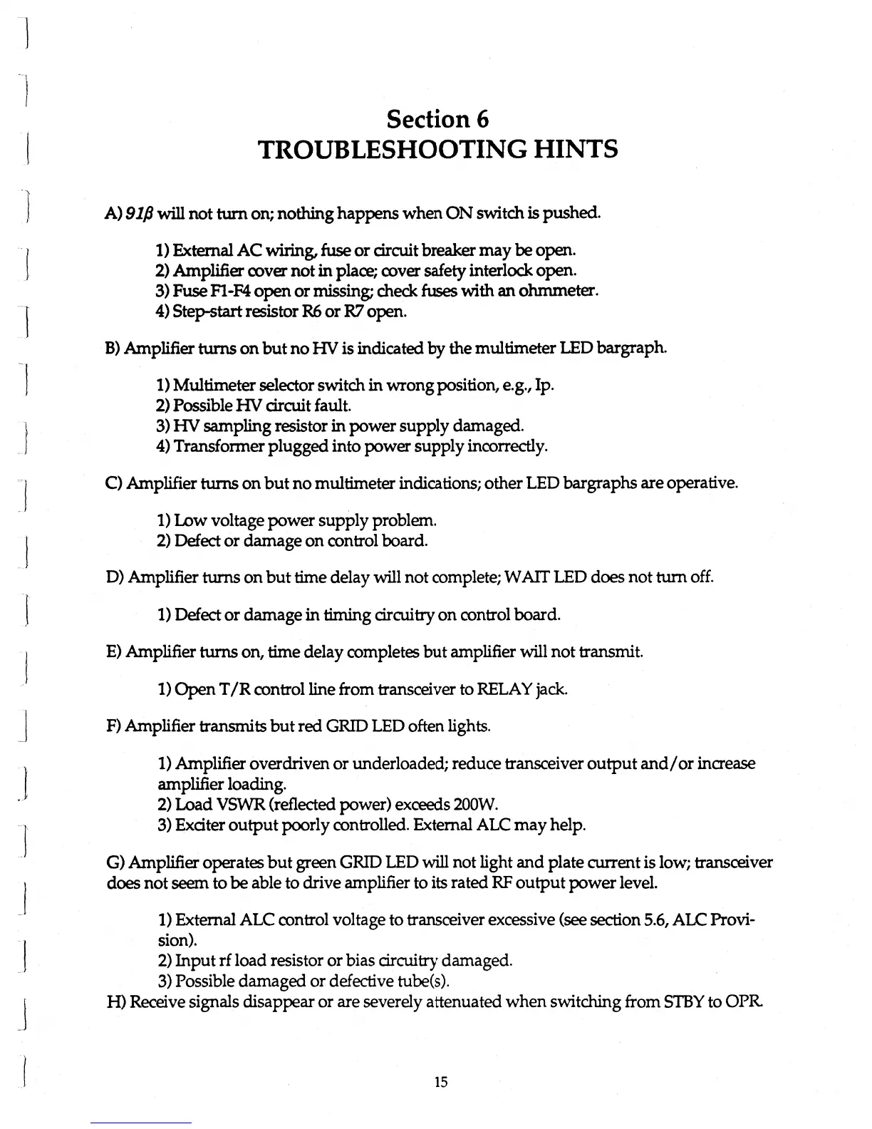 ETO 91B - Troubleshooting Common Issues; Problem A: Amplifier Not Turning On; Problem B: No HV Indicated on Multimeter; Problem C: No Multimeter Indications, Other LEDs Operative
