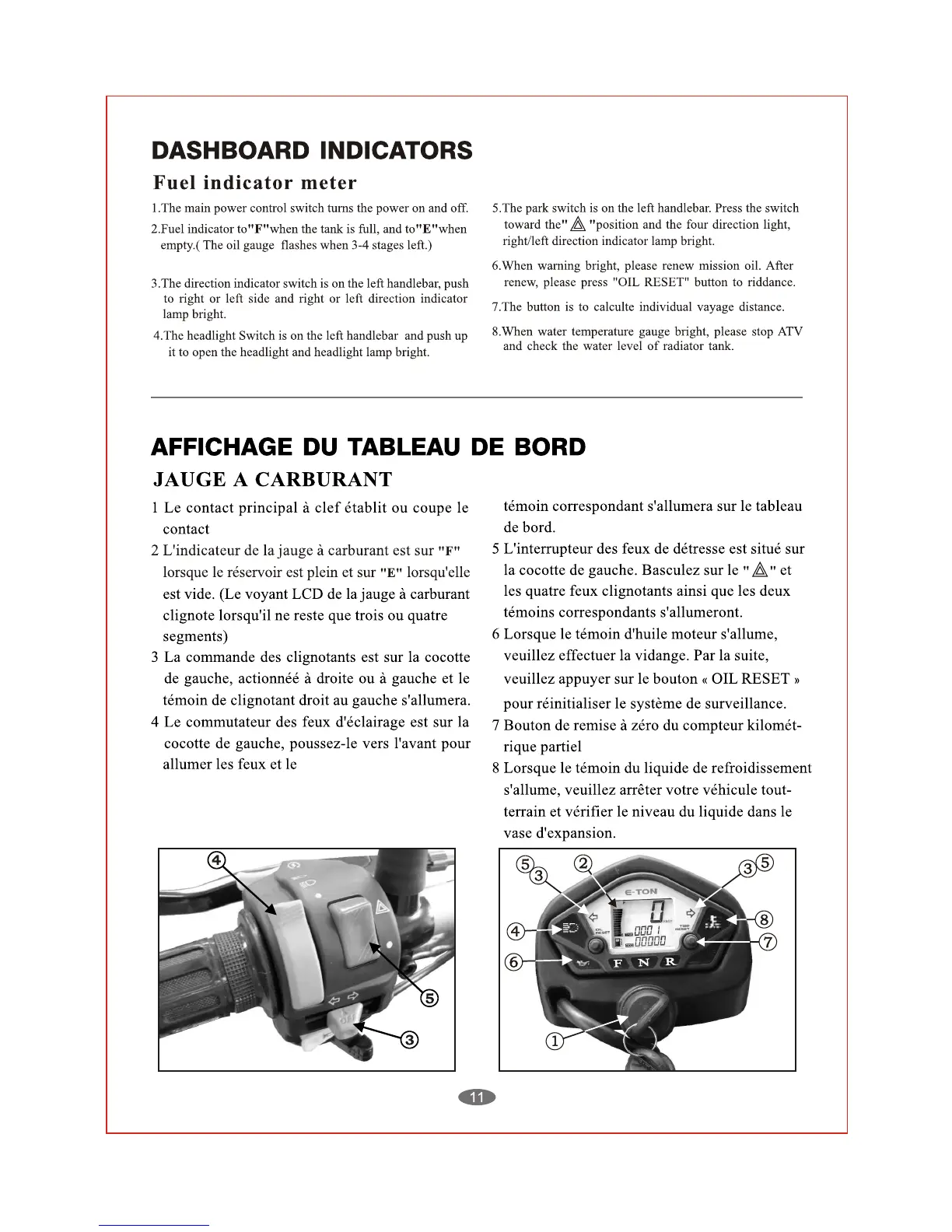 Eton ATV8E - Dashboard Indicators Explained; Fuel & Power Indicators; Lighting & Signal Indicators; Warning Lights and Reset Procedure