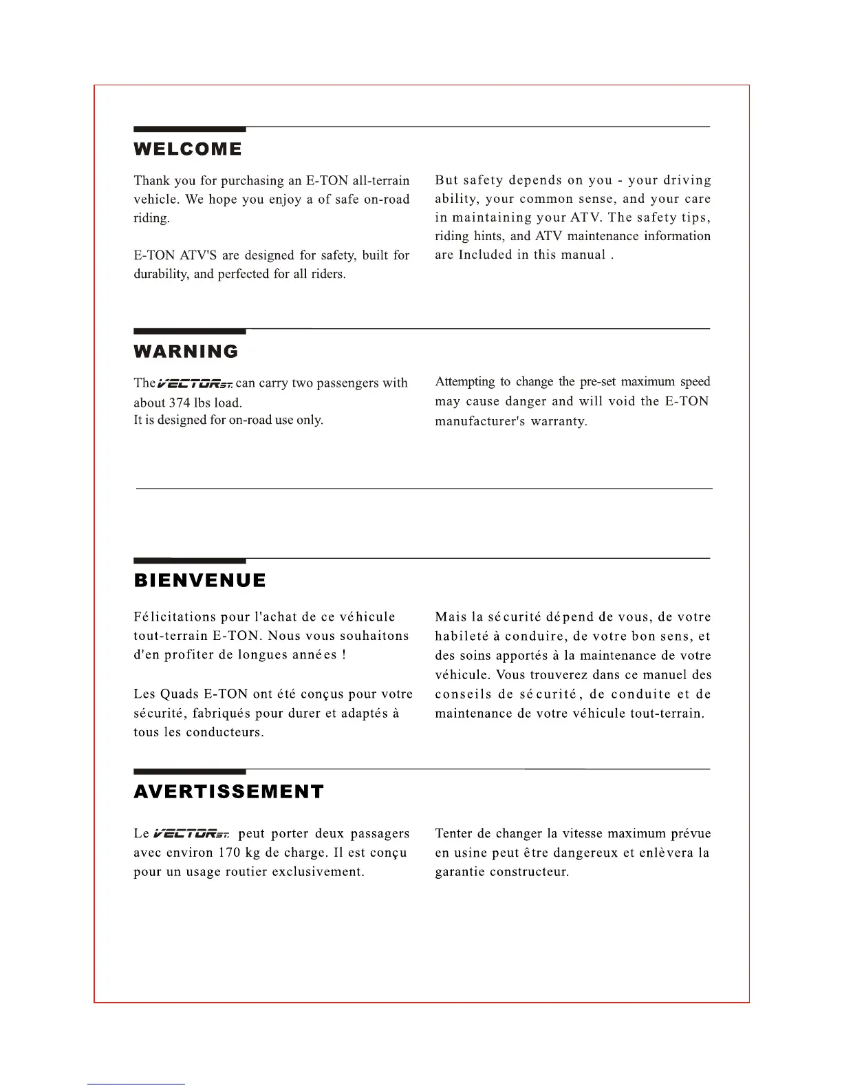 Eton ATV8E - Welcome and Safety Information; Safety and Manual Content; Load and Speed Warnings