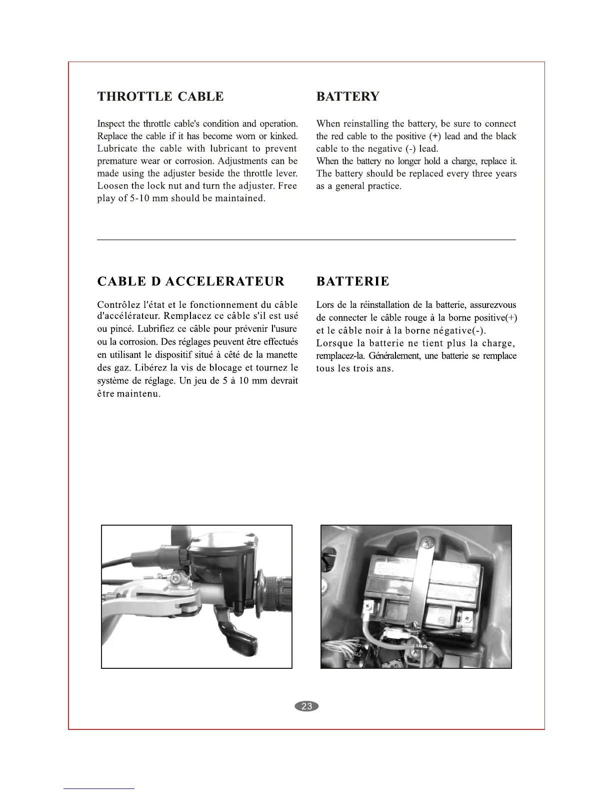Eton ATV8E - Cable and Battery Maintenance; Throttle Cable Inspection & Adjustment; Battery Installation & Replacement