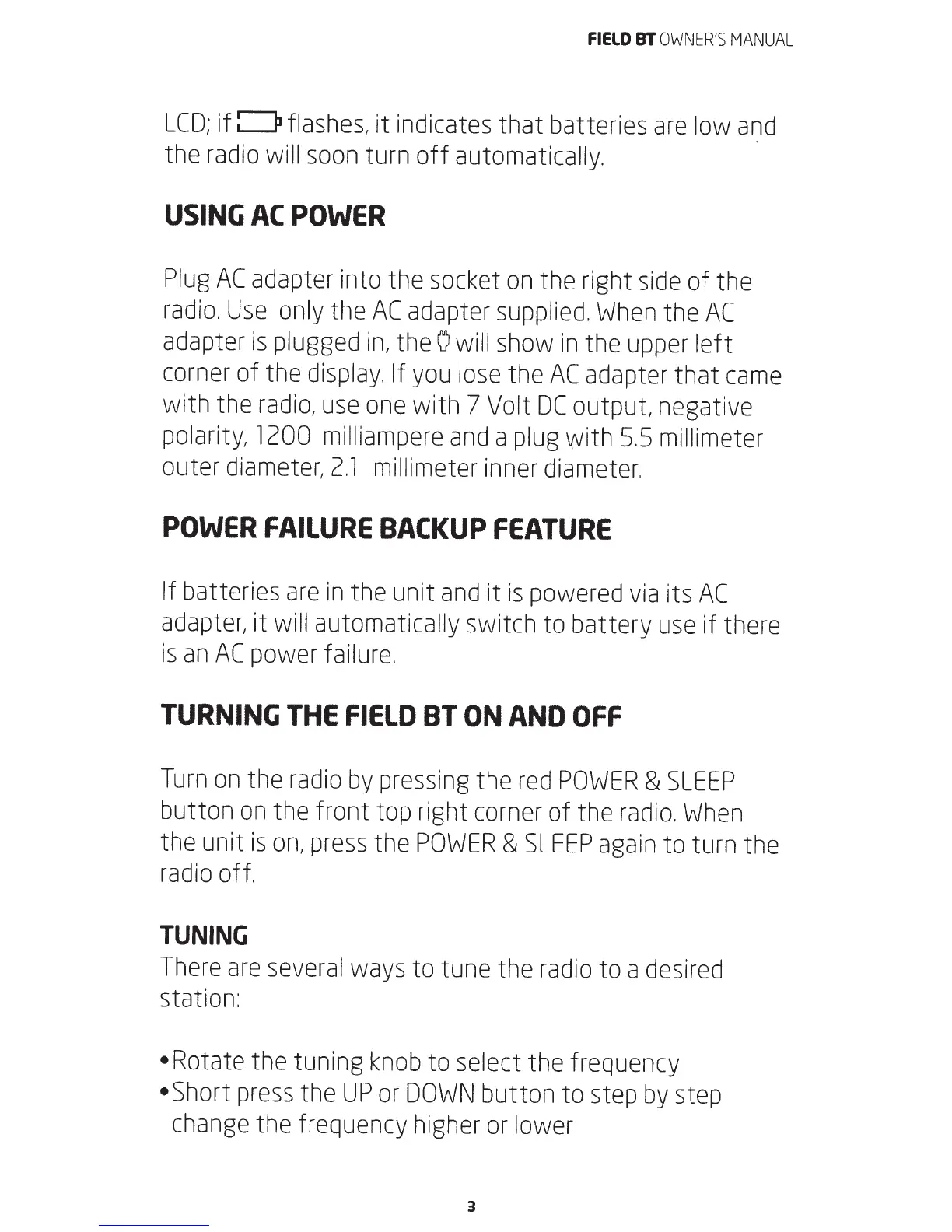 Eton FIELD BT - Using AC Power; Power Failure Backup Feature; Turning the Field BT On and Off; Tuning
