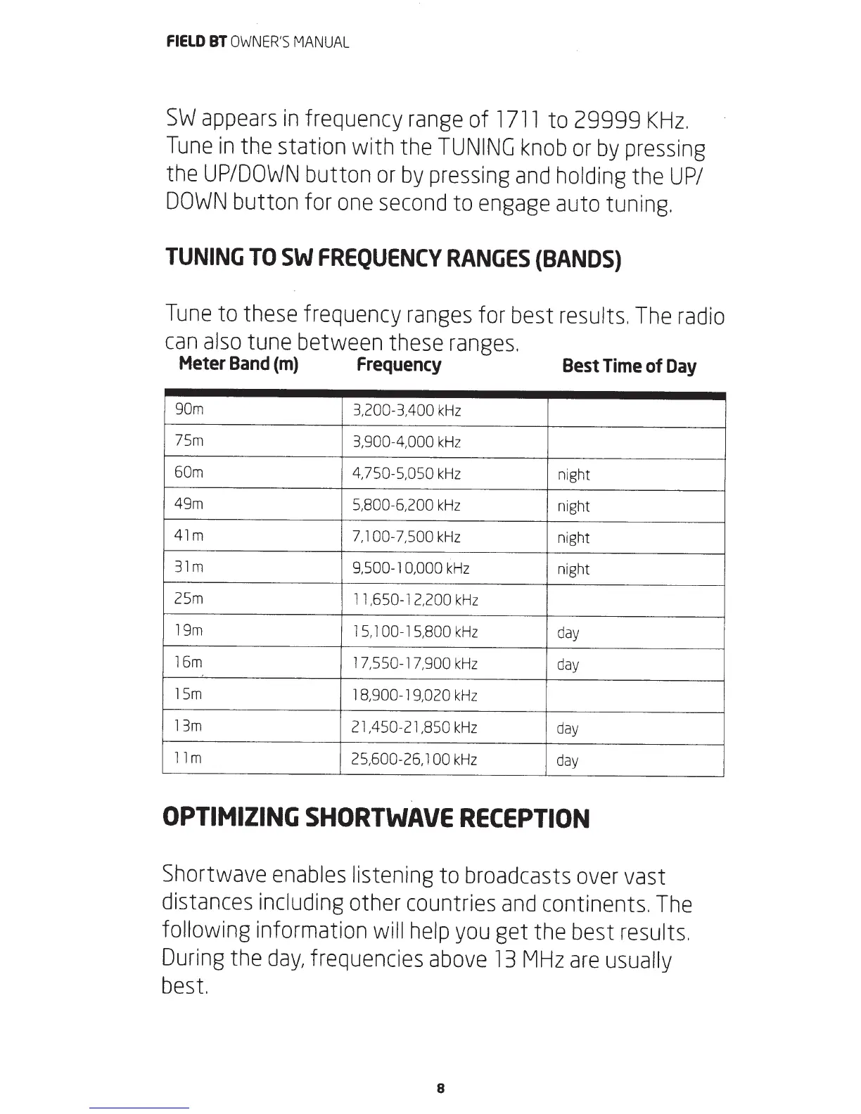 Eton FIELD BT - Tuning to SW Frequency Ranges; Optimizing Shortwave Reception