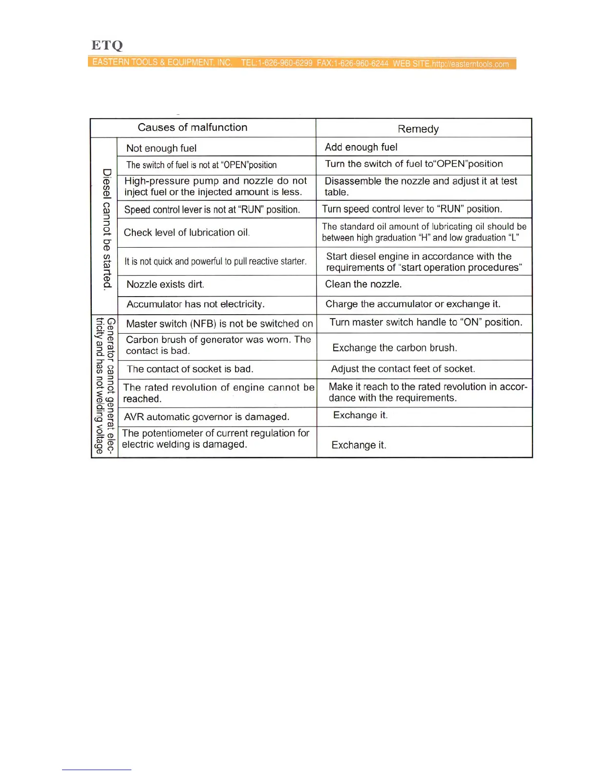 1. Model of diesel engine generator and engine model number.