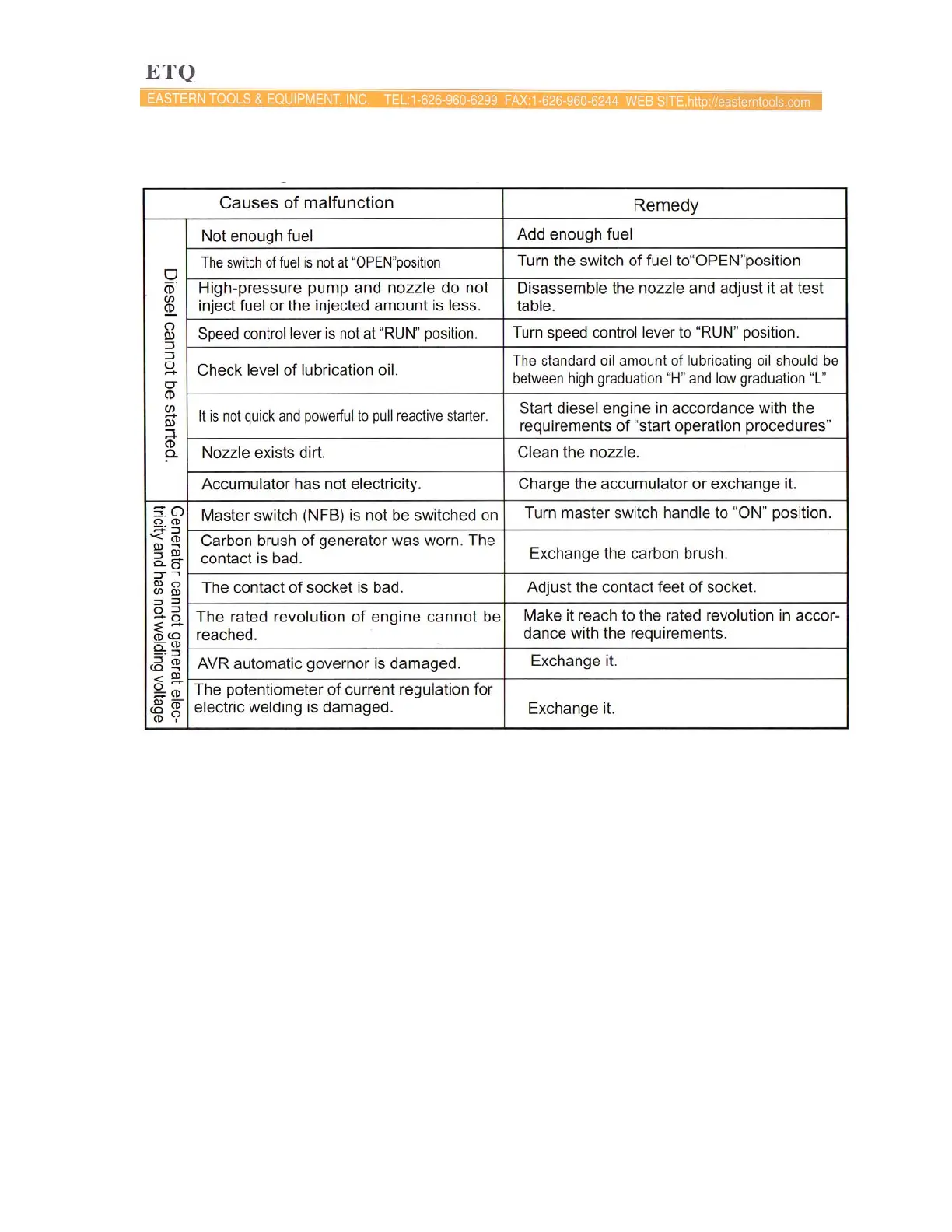 1. Model of diesel engine generator and engine model number.