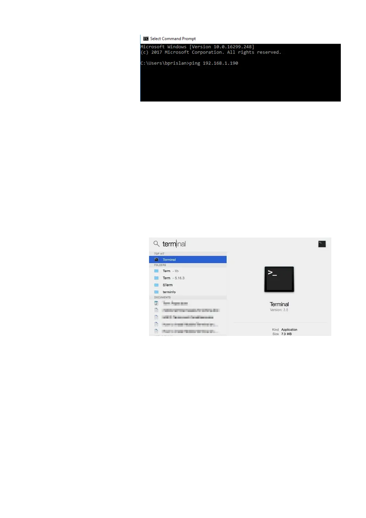 When Terminal is running write ping and IP (eg. ping 192.168.1.250).