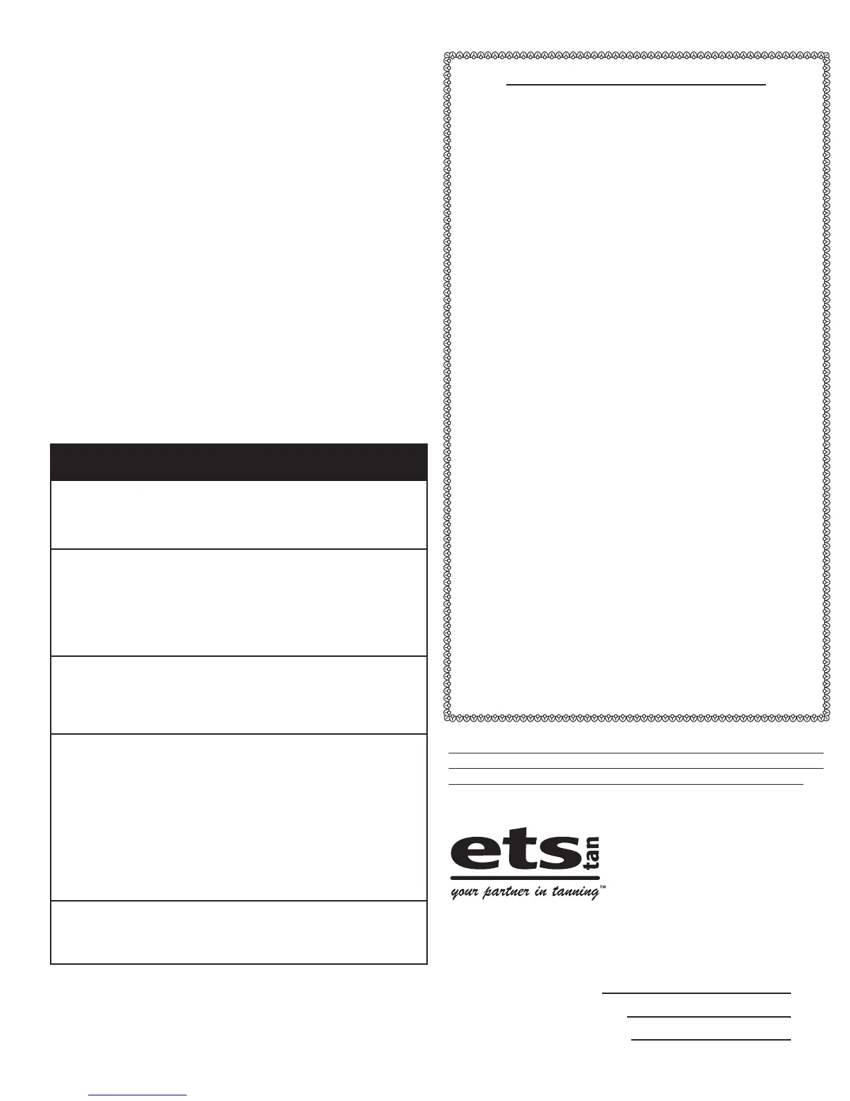 serial number specific and only applies to tanning units purchased through an authorized ETS