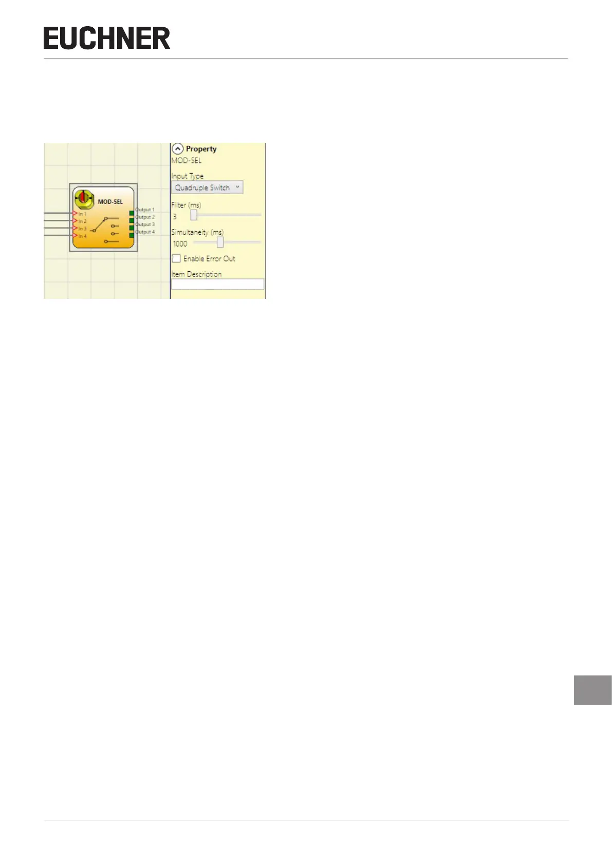 Using the MOD-SEL function block the input status of an operating mode selector switch (up to 4 inputs) is checked. If only