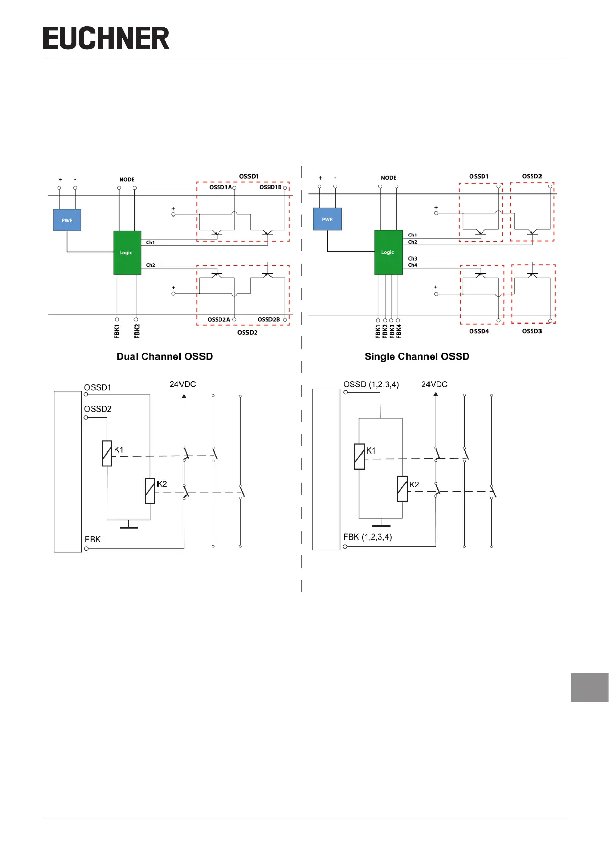 Two settings are available for the outputs (configuration via the software EUCHNER Safety Designer):