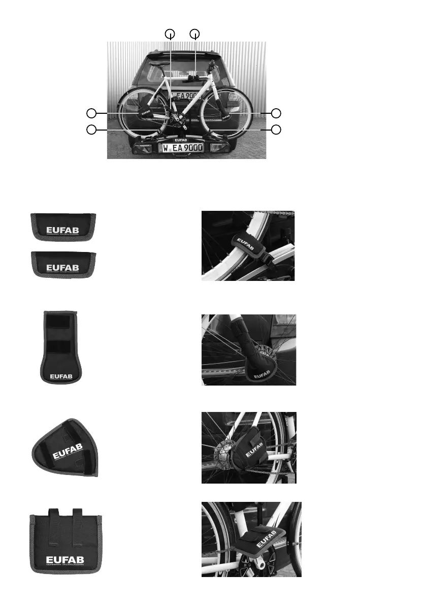 Placez les pièces de la protection comme décrit sur les illustrations plus bas. Attachez les éléments de protection à l‘aide des bandes