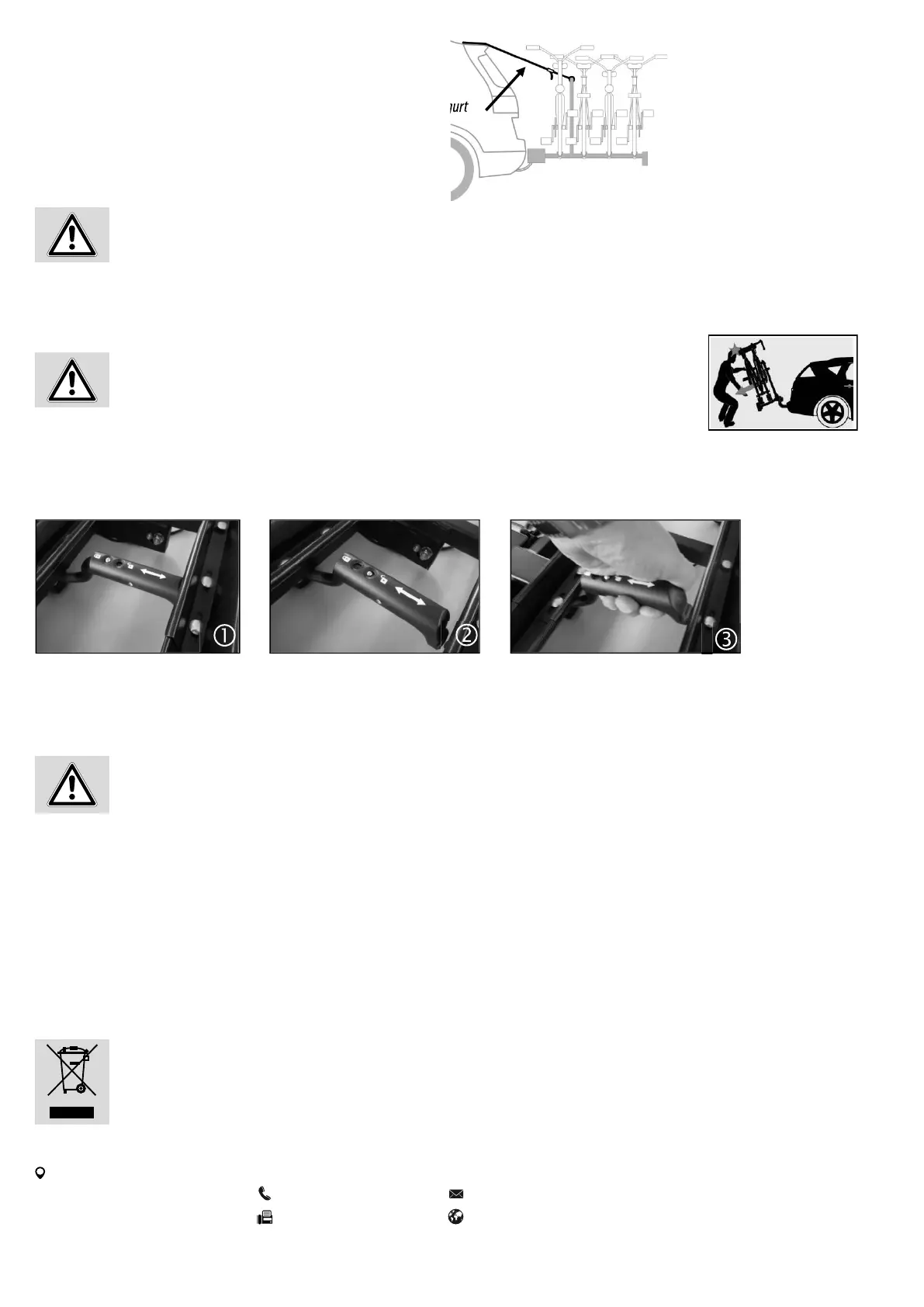 • Kontrollieren Sie den Fahrradträger regelmäßig auf Beschädigungen. Beschädigte oder verschlissene Teile sind sofort zu ersetzen. Es dürfen nur Originaler-