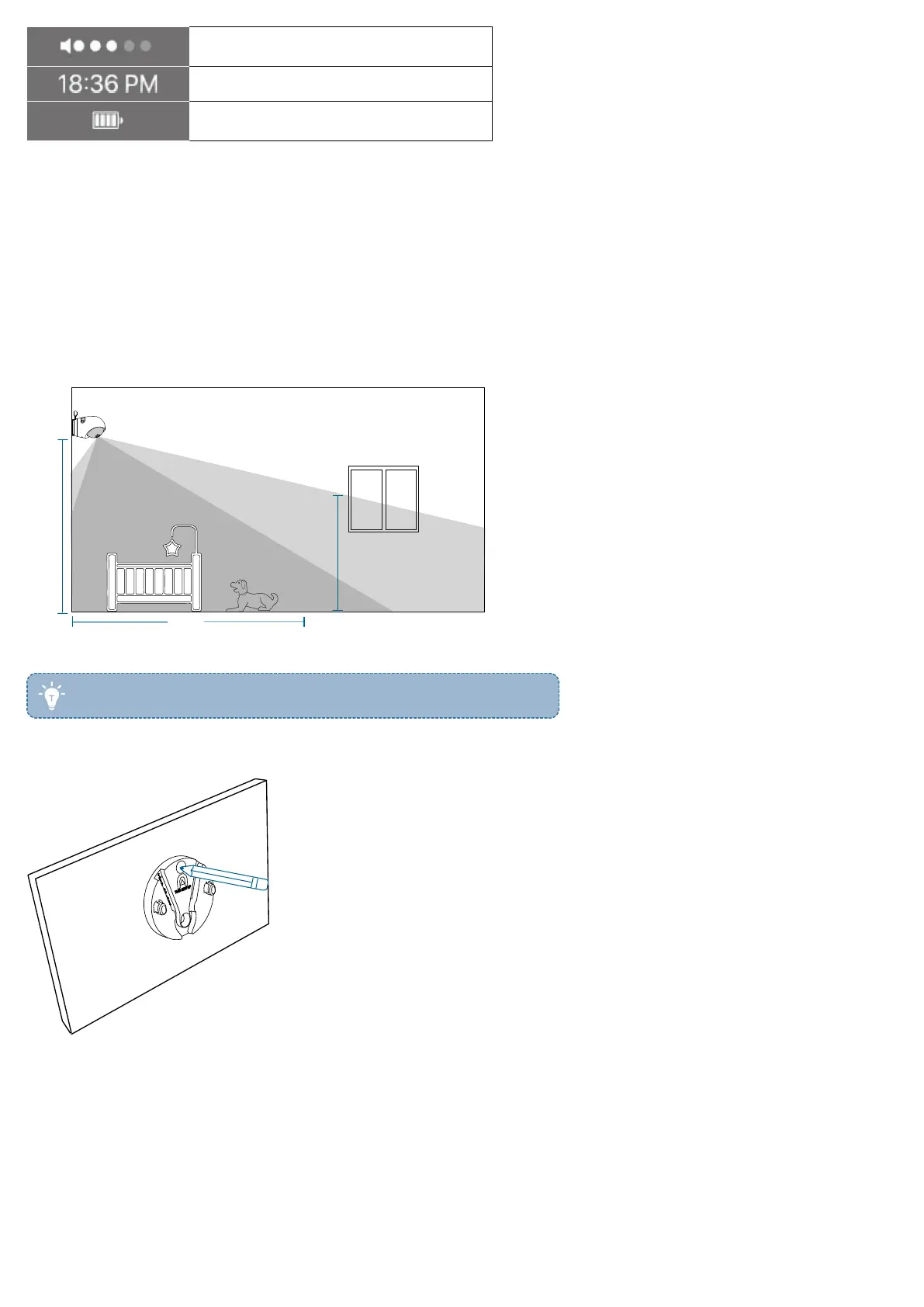 The camera can be placed on a table or shelf, or can be installed on a wall or crib.
