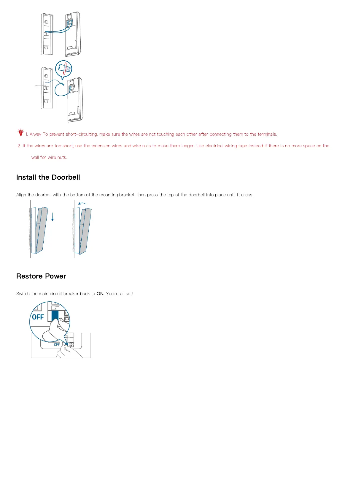 1. Alway To prevent short-circuiting, make sure the wires are not touching each other after connecting them to the terminals.