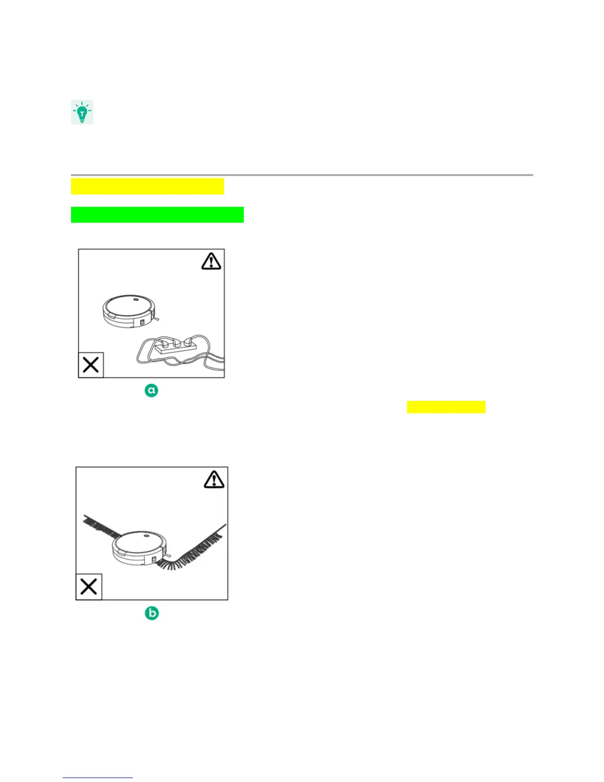 ● Remove power cords and small objects from the floor that may entangle RoboVac.