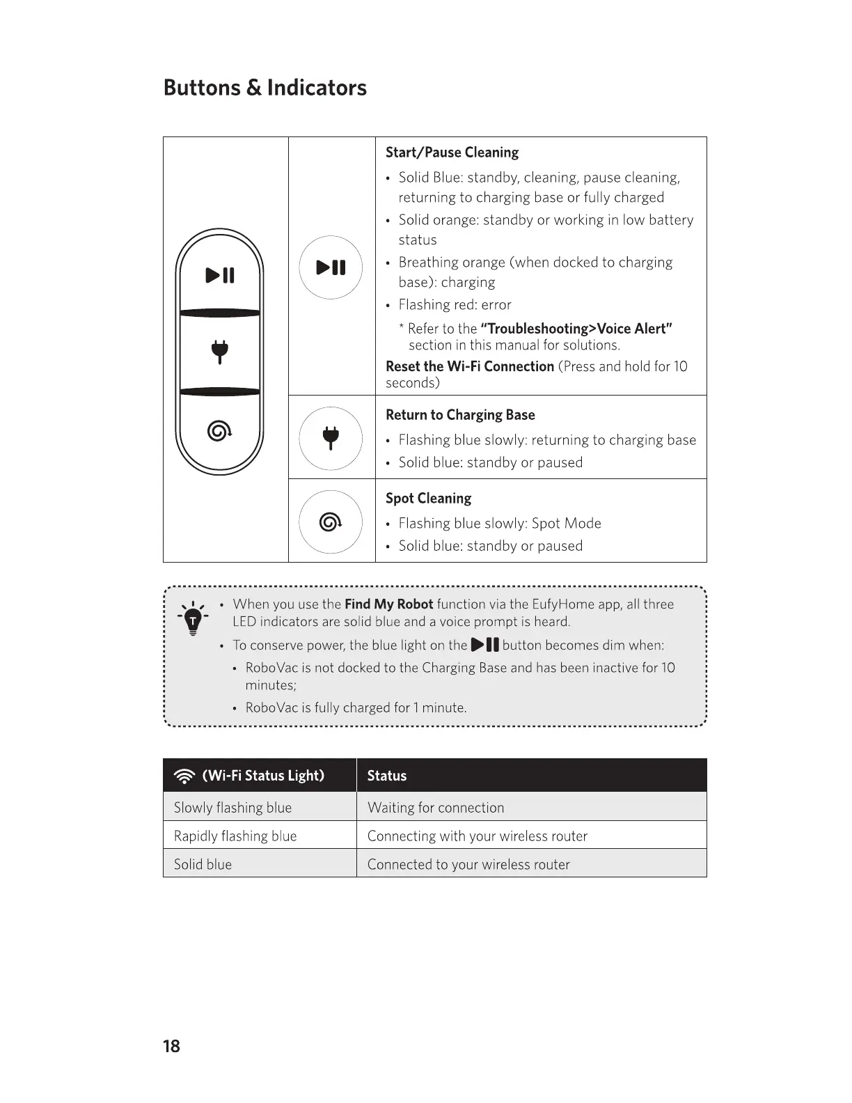 • Solid Blue: standby, cleaning, pause cleaning,