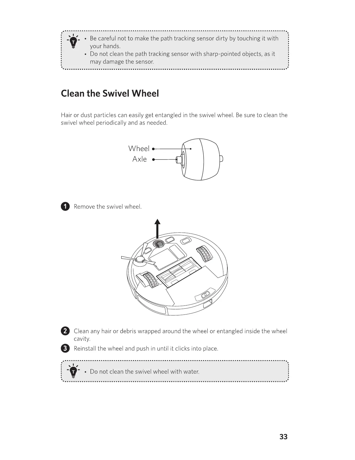 • Do not clean the swivel wheel with water. l