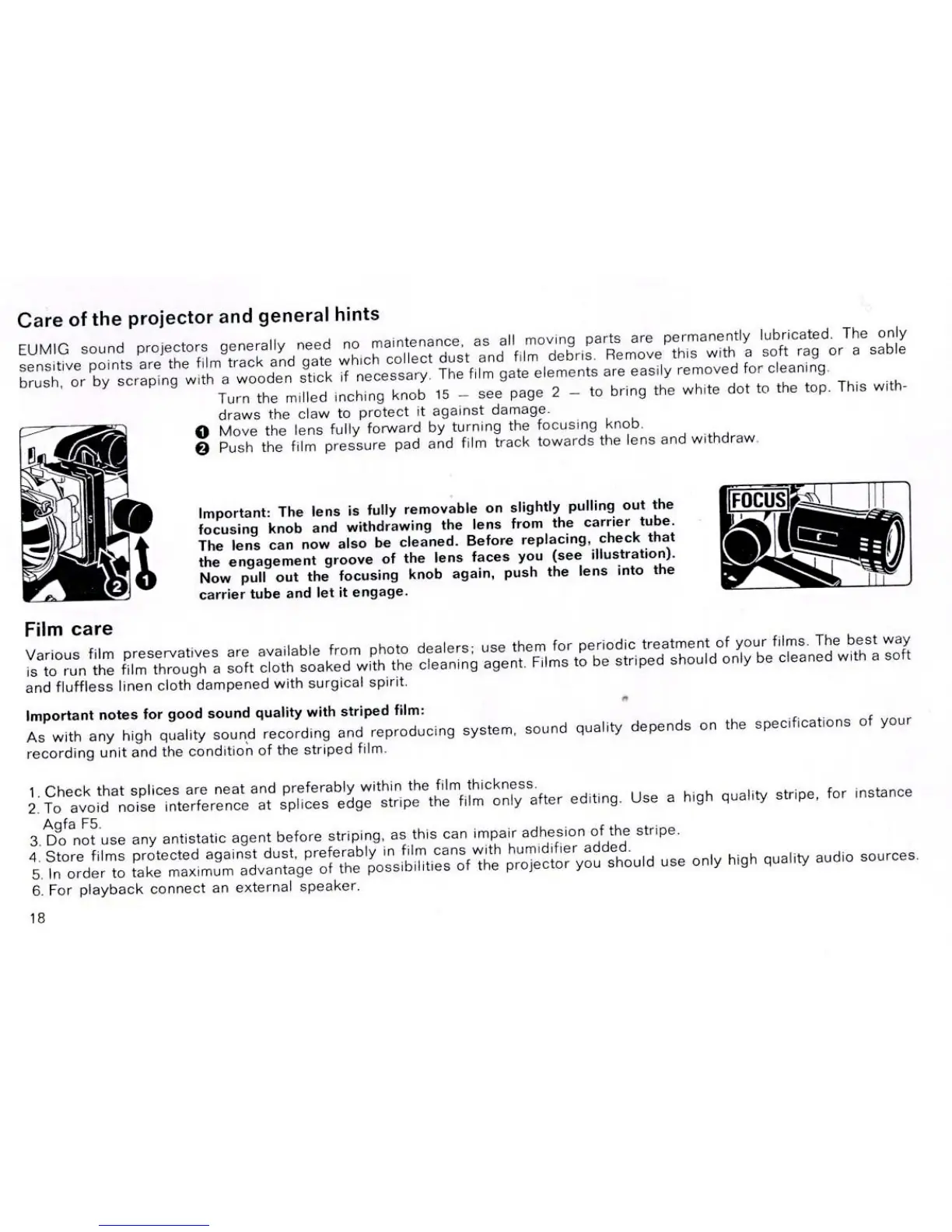 Eumig MARK S 802 - Projector Care; Clean Film Track and Gate; Clean Lens; Film Care