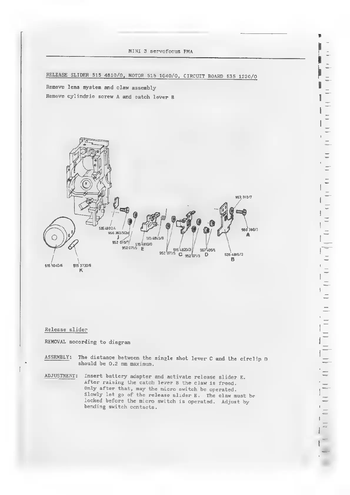 Eumig MINI 3 SERVOFOCUS - RELEASE SLIDER, MOTOR, CIRCUIT BOARD; Removal; Assembly; Adjustment