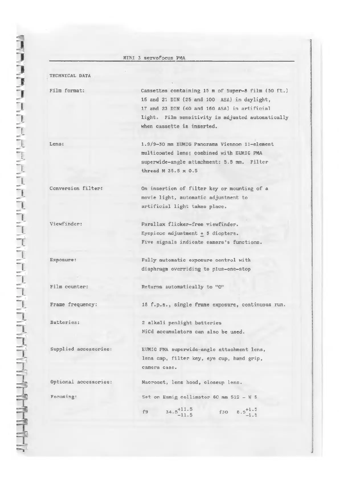 Eumig MINI 3 SERVOFOCUS - TECHNICAL DATA; Film format; Lens; Conversion filter