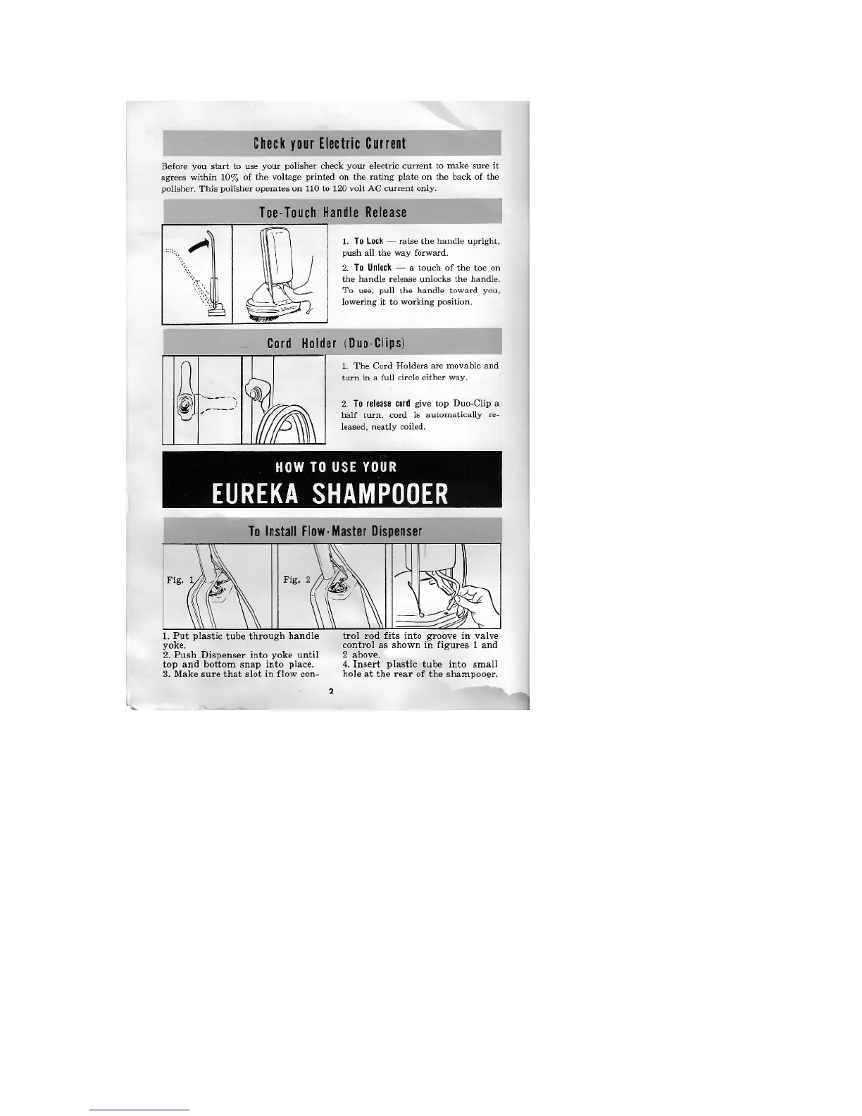 Eureka 34 - Check Electric Current; Toe-Touch Handle Release; Cord Holder (Duo-Clips); Using Your Eureka Shampooer