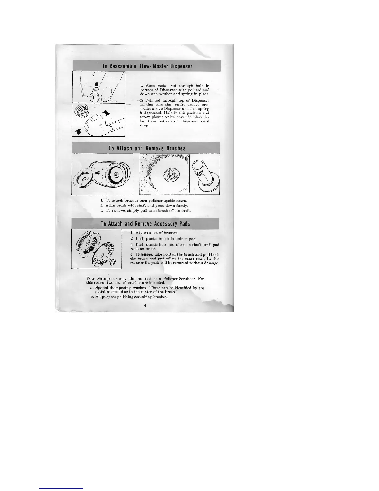 Eureka 34 - To Reassemble Flow-Master Dispenser; To Attach and Remove Brushes; To Attach and Remove Accessory Pads