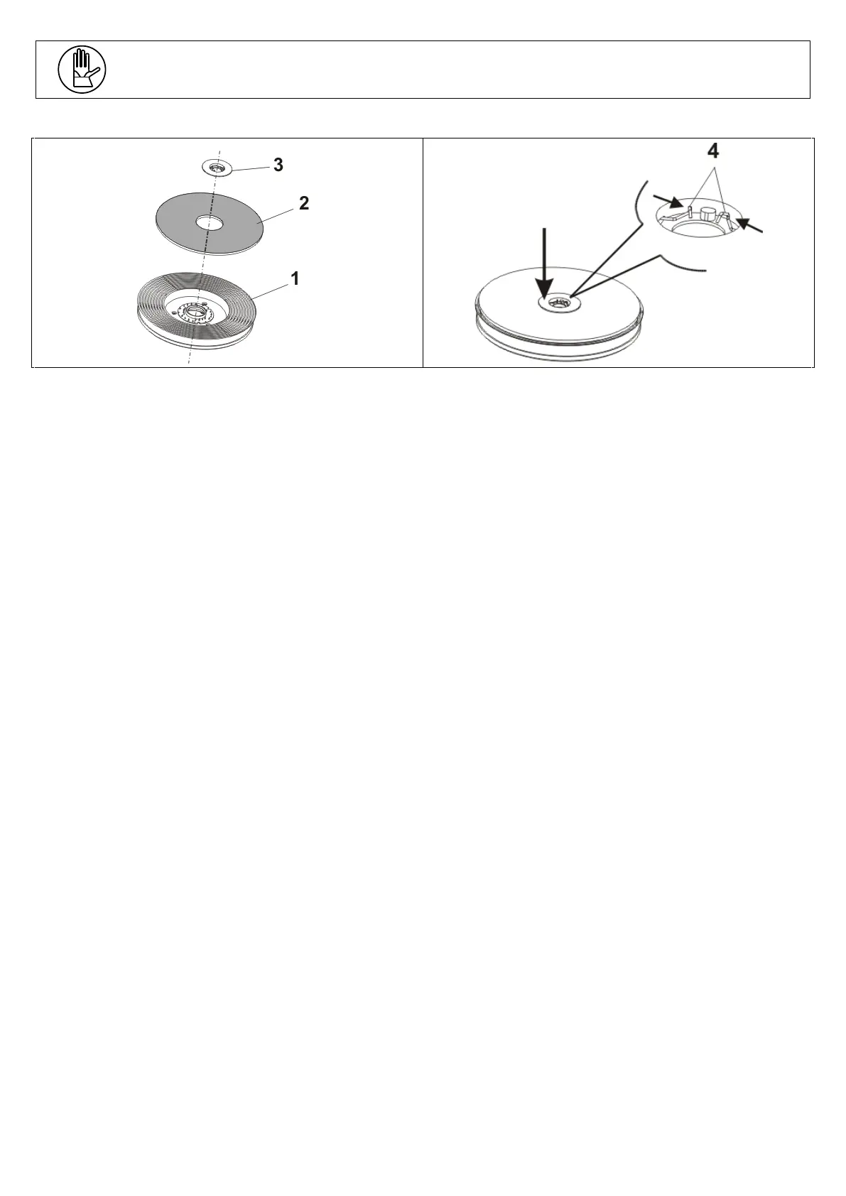 Place the disc lock (position 3) on the center and press down hard until the spring fits into place (position 4);