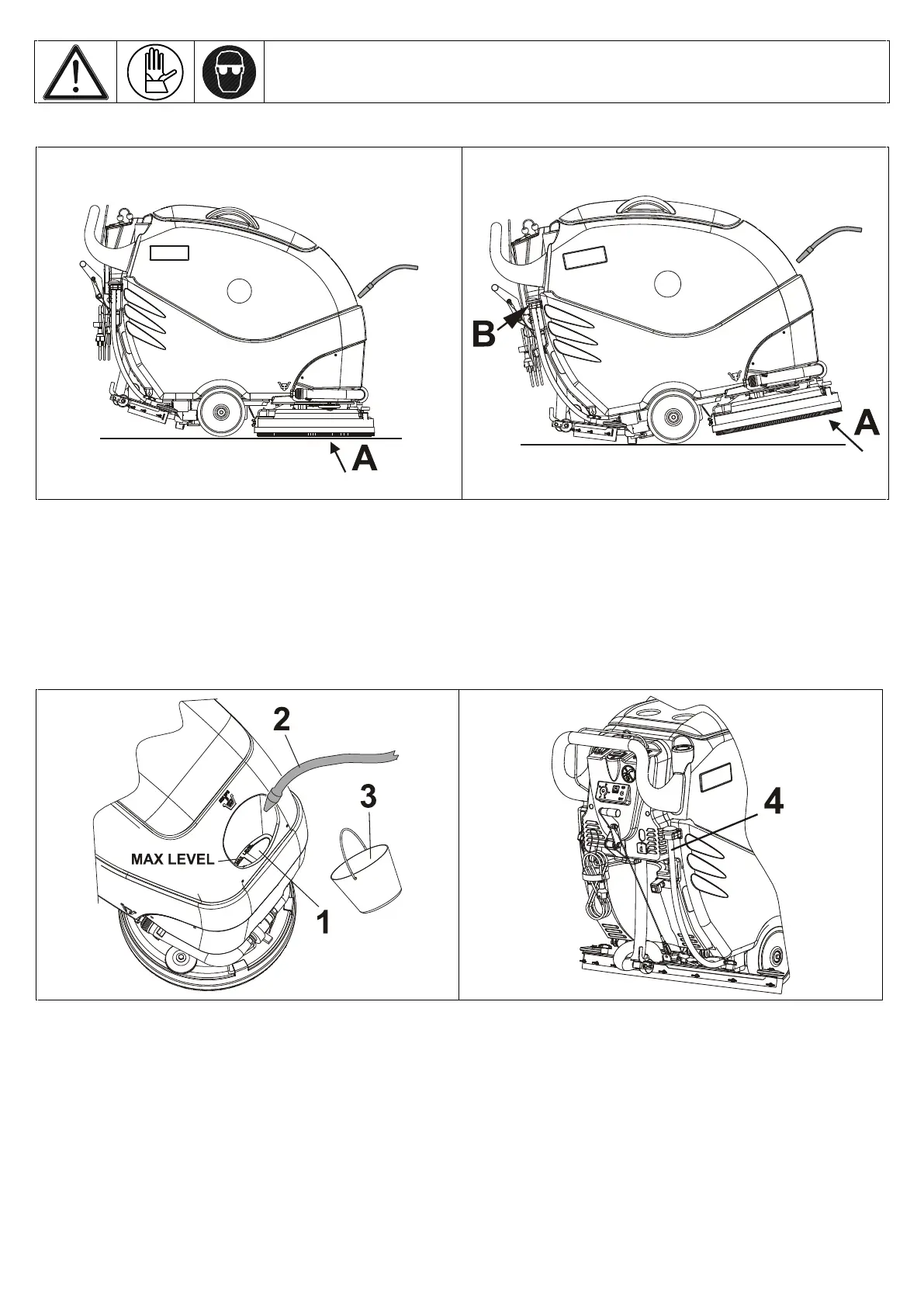 To correctly fill the tank, the machine must be in work position as in fig. 1 with the brush (pos. A) resting on