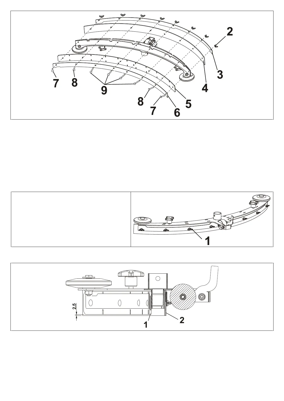 Make sure the front blade (see position 1) is fitted evenly and check for any deformations due to tightening the screws