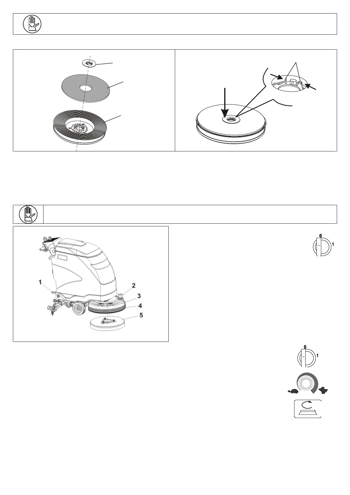 Position the abrasive disc (position 2) and centre it onto the disc pad holder (position 1).